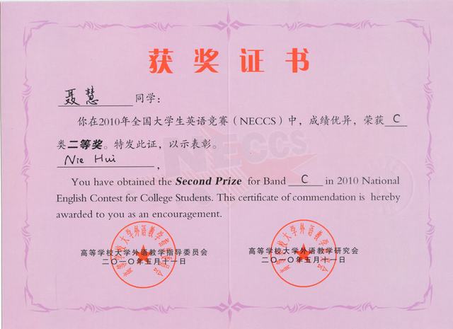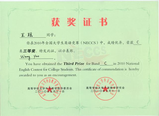 Recently Jingjiang College achieved outstanding results in the “2010 National English Contest for College Students”. Students named Nie Hui from the School of Pharmacy, and Wang Yao from the School of Laboratory Medicine, got the second and thirdawards respectively. NECCS is known as a nation-wide English contest, held annually by the Ministry of Foreign Language Teaching Higher Education Steering Committee and the College Foreign Language Teaching Research Council, and is at present the largest and most authoritative contest for college students. We all hope JC students will make persistent efforts and achieve even better results in the next run.