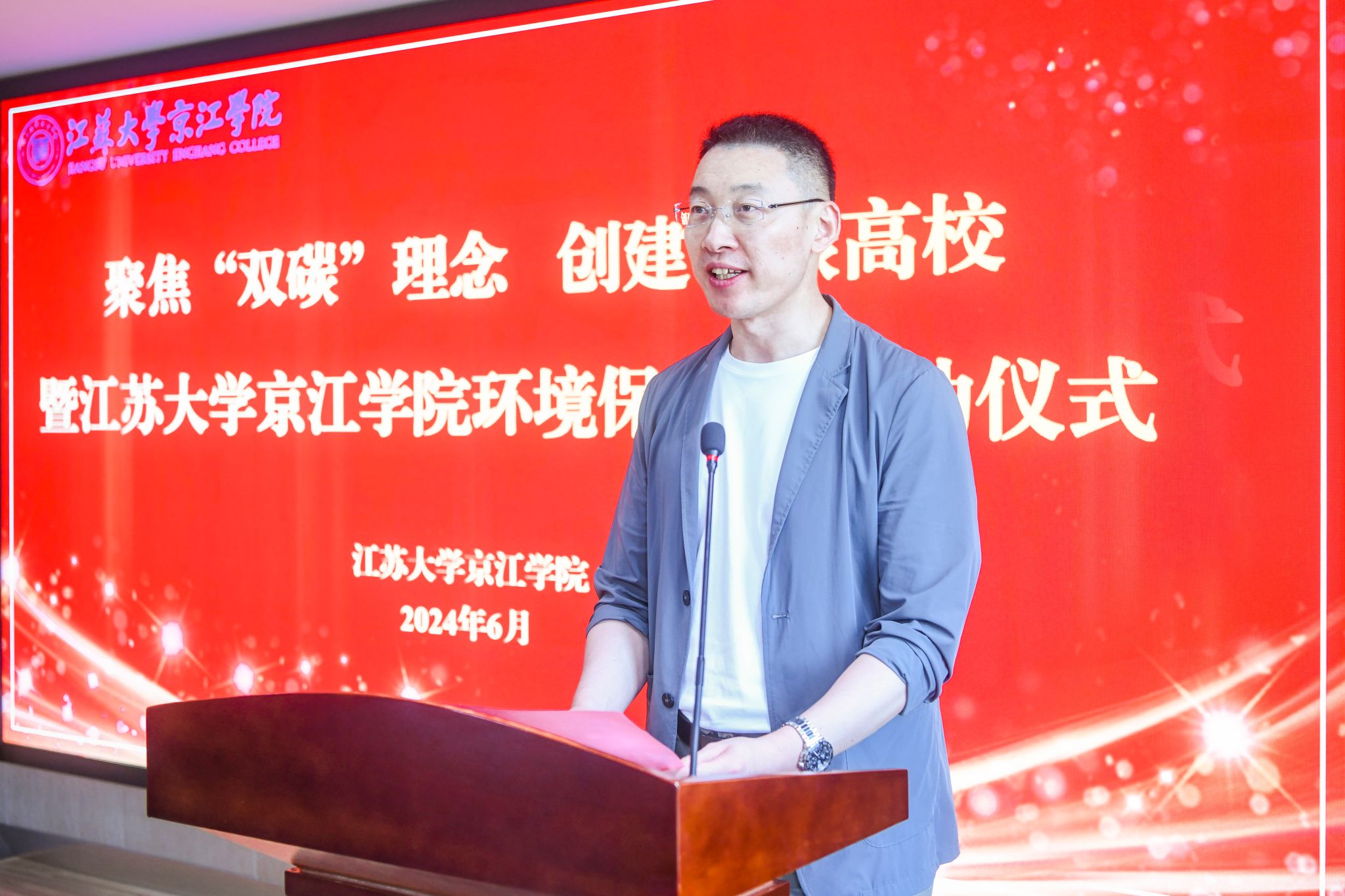 On June 3, Jingjiang College held the launching ceremony of focusing on the "dual carbon" concept and creating a low-carbon college and the environmental protection month of Jingjiang College of Jiangsu University to further promote the taking root of Xi Jinping's thought on ecological civilization. Chen Changzhi, deputy director of Zhenjiang Ecological Environment Bureau, Tong Manping, director of Climate Change Response Office of Zhenjiang Ecological Environment Bureau, all college leaders, alumni representatives, Zhou Junjun, executive director and general manager of Hefei Aiwangyou Education Consulting Co., Ltd., and more than 100 representatives of teachers and students of the college participated in the activity.