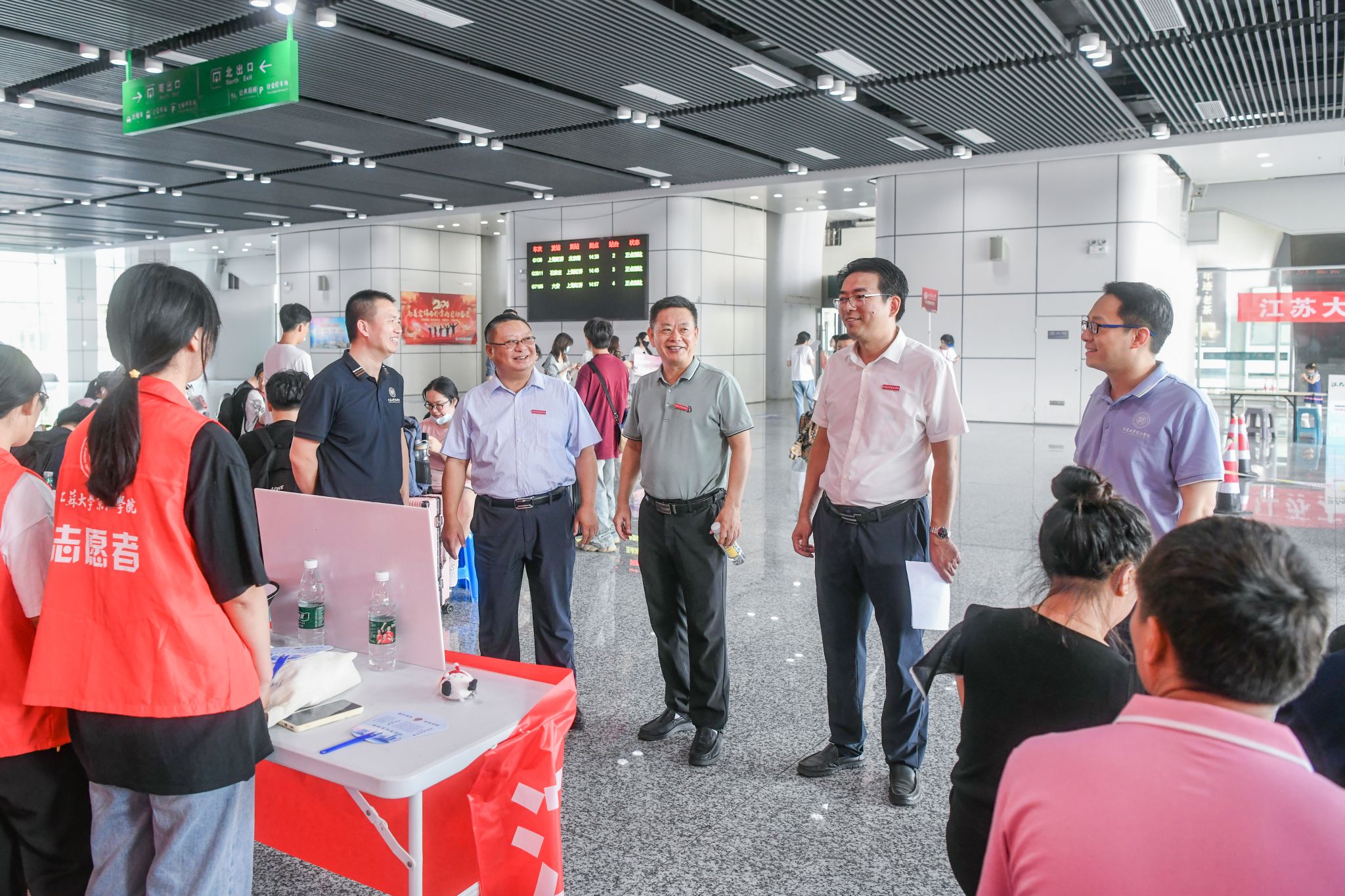 During this period, Cui Jingui, the Party secretary of Jingjiang College, and Du Daolin, the dean of Jingjiang College, led a team to the orientation points at the station to console the volunteers and visit the freshmen. Cui Jingui expressed his gratitude to the volunteers who stuck to their posts, affirmed that the orientation volunteers wholeheartedly did a good job in the orientation service and demonstrated the good spiritual outlook of Jingjiang College, and reminded the volunteers to pay attention to heatstroke prevention as the weather was hot. Du Daolin extended a warm welcome to the freshmen and their parents, and wished the students to start a new journey in the university, pursue their dreams in Jingjiang College and build their dreams for the future.