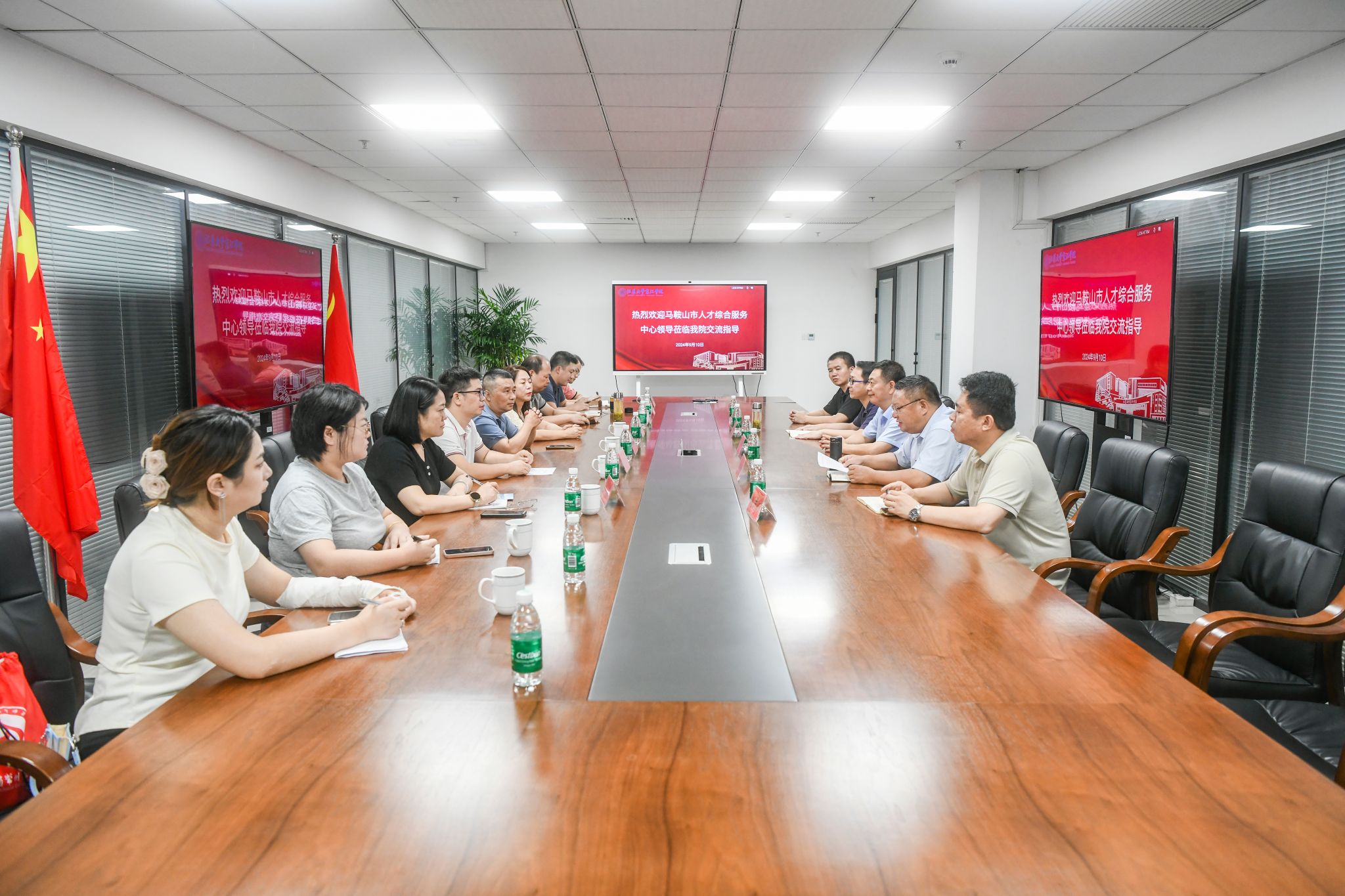 In order to seize the crucial period for promoting employment work in the autumn and pool the efforts of colleges and universities and employers to facilitate high-quality and full employment for the graduates of the class of 2025, on September 10th, the Ma'anshan Human Resources Management and Service Center joined hands with outstanding local employers to visit Jingjiang College and carry out the activity of "Gathering Talents in the Poetic City - Campus Tour". Before the job fair started, the two sides held a symposium in the conference room of the administrative building. Cui Jingui, the Party secretary of Jingjiang College, Du Daolin, the dean of Jingjiang College, and the heads of relevant functional departments participated in this meeting, which was chaired by the head of the Student Affairs Department.