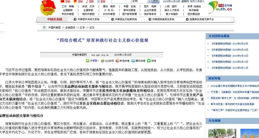11月19日,团中央官网报道了我院共青团思想引领工作的做法和经验——“四结合模式”培育和践行社会主义核心价值观。网站链接: