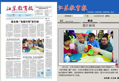 江苏教育报4月23日头版以图片新闻形式报道了我院青年志愿者活动——“江苏大学京江学院大学生志愿者走进镇江市京口特教中心,开展‘结对特教儿童’活动。大学生志愿者与该校20多名智障儿童结对,将定期为他们提供学习辅导、活动指导和心理疏导等爱心服务。图为大学生在指导小朋友用废旧材料制作手工作品。”