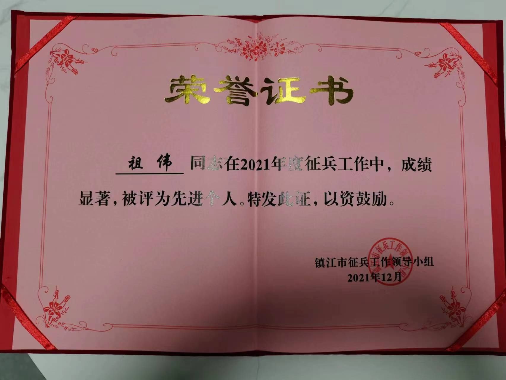 近期,镇江市征兵工作领导小组对全市各征兵办公室、乡镇(街道)武装部及高校征兵工作站先进单位和先进个人进行表彰,我院获评2021年度镇江市“征兵工作先进单位”。学生工作部祖伟老师被评为2021年度镇江市“征兵工作先进个人”。