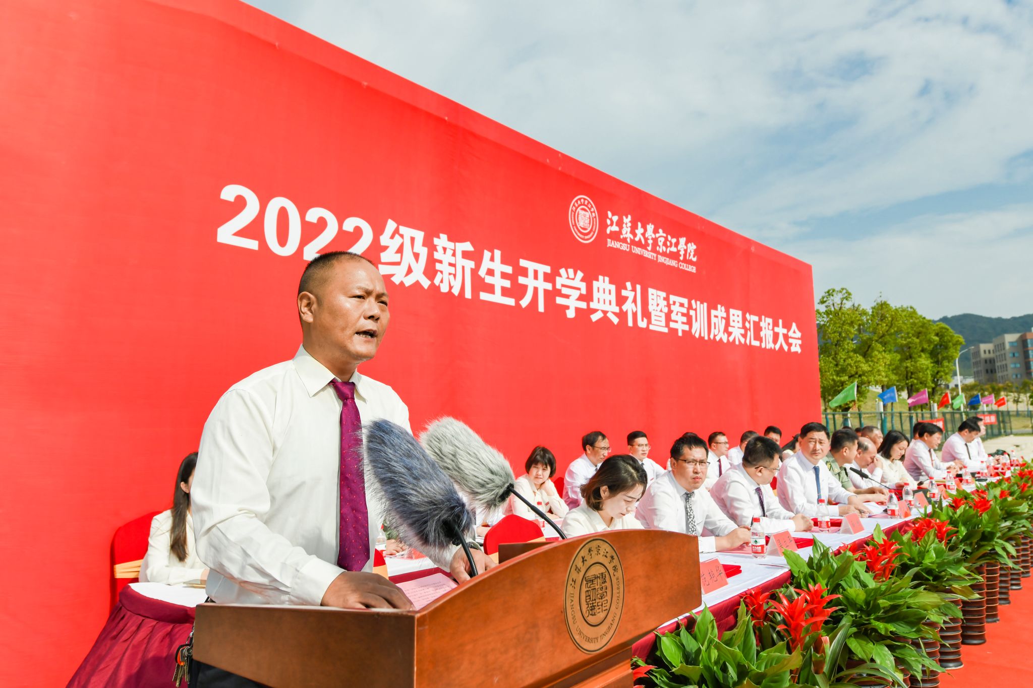 典礼上,院长赵喜仓代表全体师生对2022级新同学的到来表示衷心的祝贺和热烈的欢迎,向支持我院军训工作的领导、教官和老师们致以亲切的慰问和诚挚的感谢。赵喜仓介绍了镇江的历史文化和江苏大学京江学院的发展历程及成就,希望同学们在成为“京江人”之时,把自己的青春融入江大血脉,植入江大基因,在挥洒青春、追求卓越的道路上,“励志笃行,成才强国”,努力把自己培养成为德智体美劳全面发展的社会主义建设者和接班人,做一个有理想、有情怀的人,一个有知识、有智慧的人,一个有担当、有作为的人。
