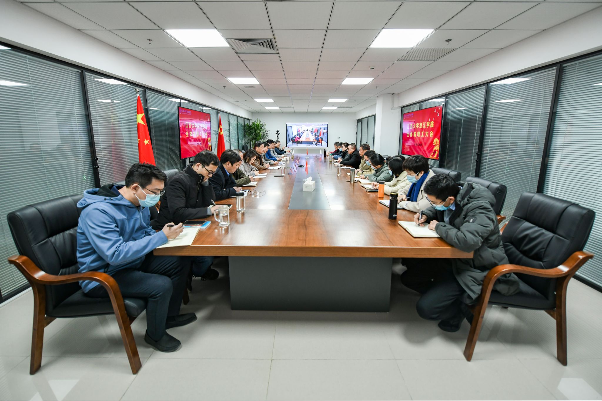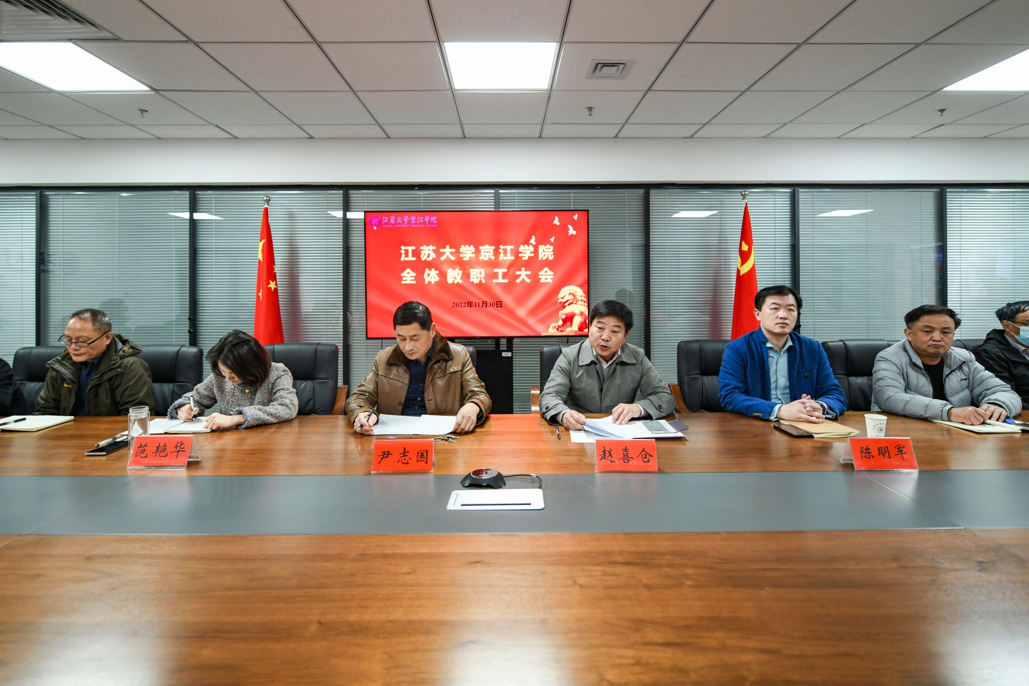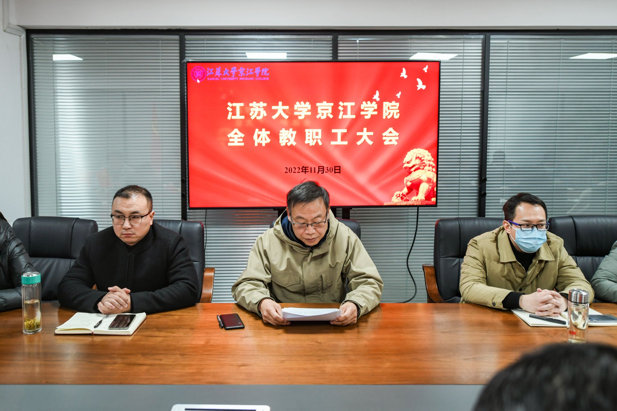 11月30日,江苏大学京江学院在行政楼302会议室召开全体教职工大会,学校领导班子成员,各职能部门主要负责人,各二级学院(部)党总支书记、院长,在主会场参加会议,其他教职工通过腾讯会议线上参会。会议由党委书记尹志国主持。