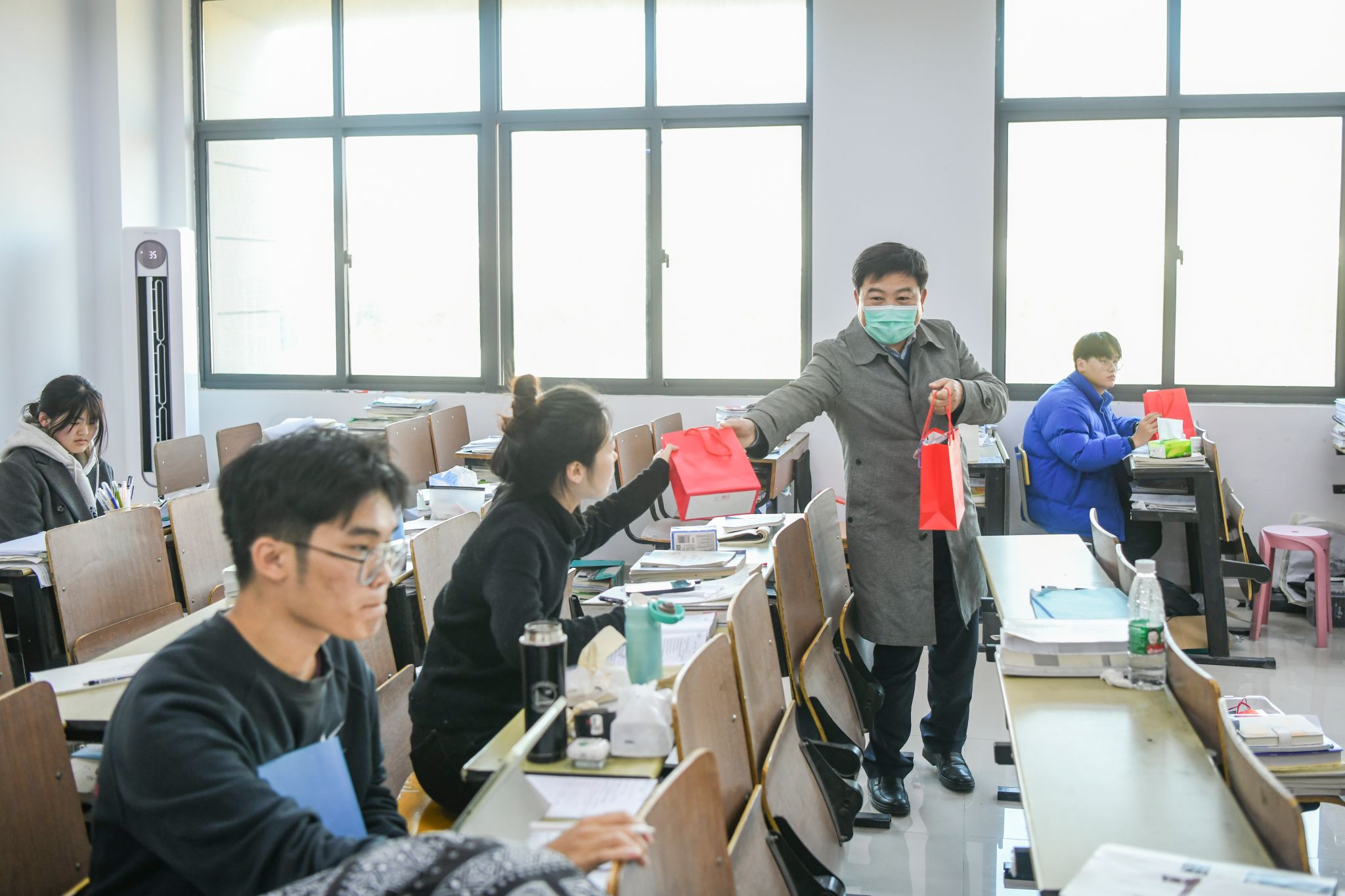 在考研教室,赵喜仓为在场的备考学生送上文具、口罩和餐券,关切询问学习和生活情况,叮嘱大家非常时期,也是关键时期,要做好疫情防护,注意休息、营养和健康。他勉励所有考研学生要以最坚定的信心、最稳定的心态、最沉着的应对、最有效的发挥完成考试,并预祝大家全部成功上岸。