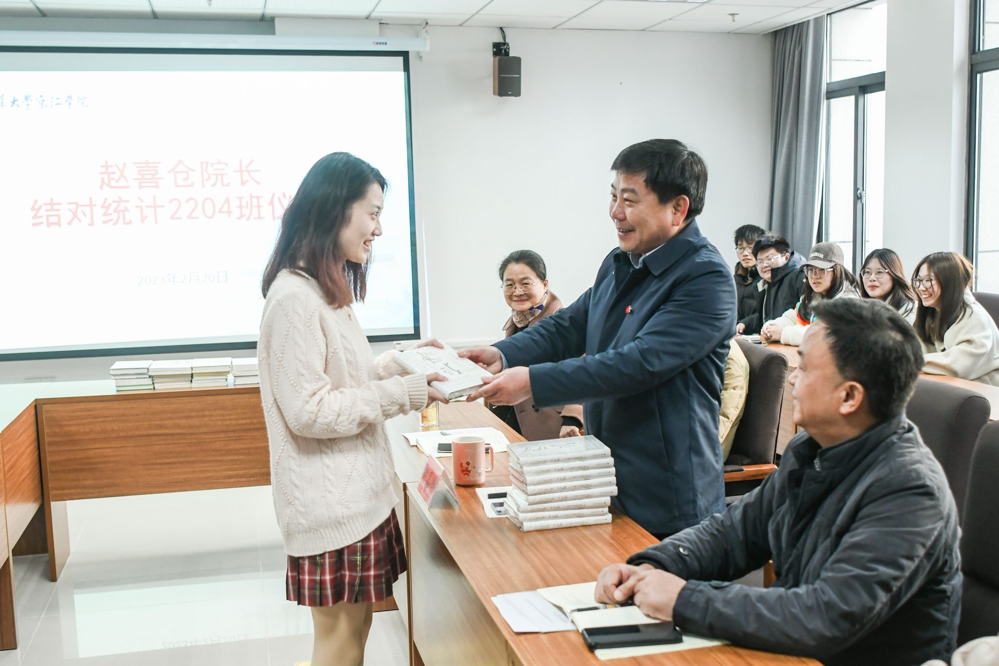 统计专业2204班全体同学对赵喜仓的到来表示热烈欢迎。班长董佳怡向赵喜仓汇报了班级的基本情况。