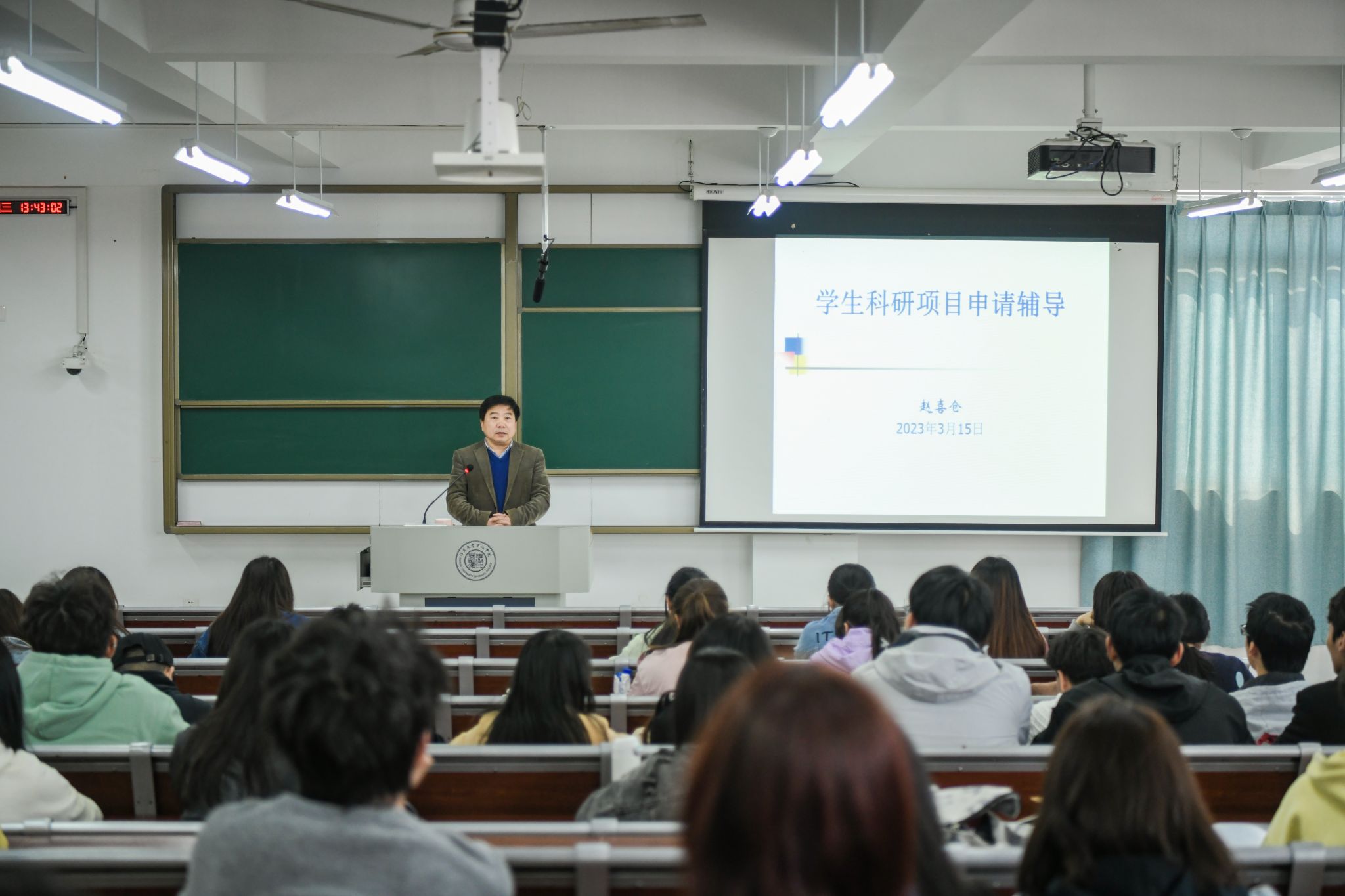 赵喜仓就人文社科类科研项目的申报进行了辅导讲座。他从学校设立学生科研立项的目的,学生科研立项的申报要求以及申报书的写作要点与注意事项展开。他重点讲解了学生科研立项申报书的主要内容,以及各部分内容的撰写方法。讲座中,他以一份真实申报书为案例进行分析,使同学们对申报书的撰写有了直观的认识。