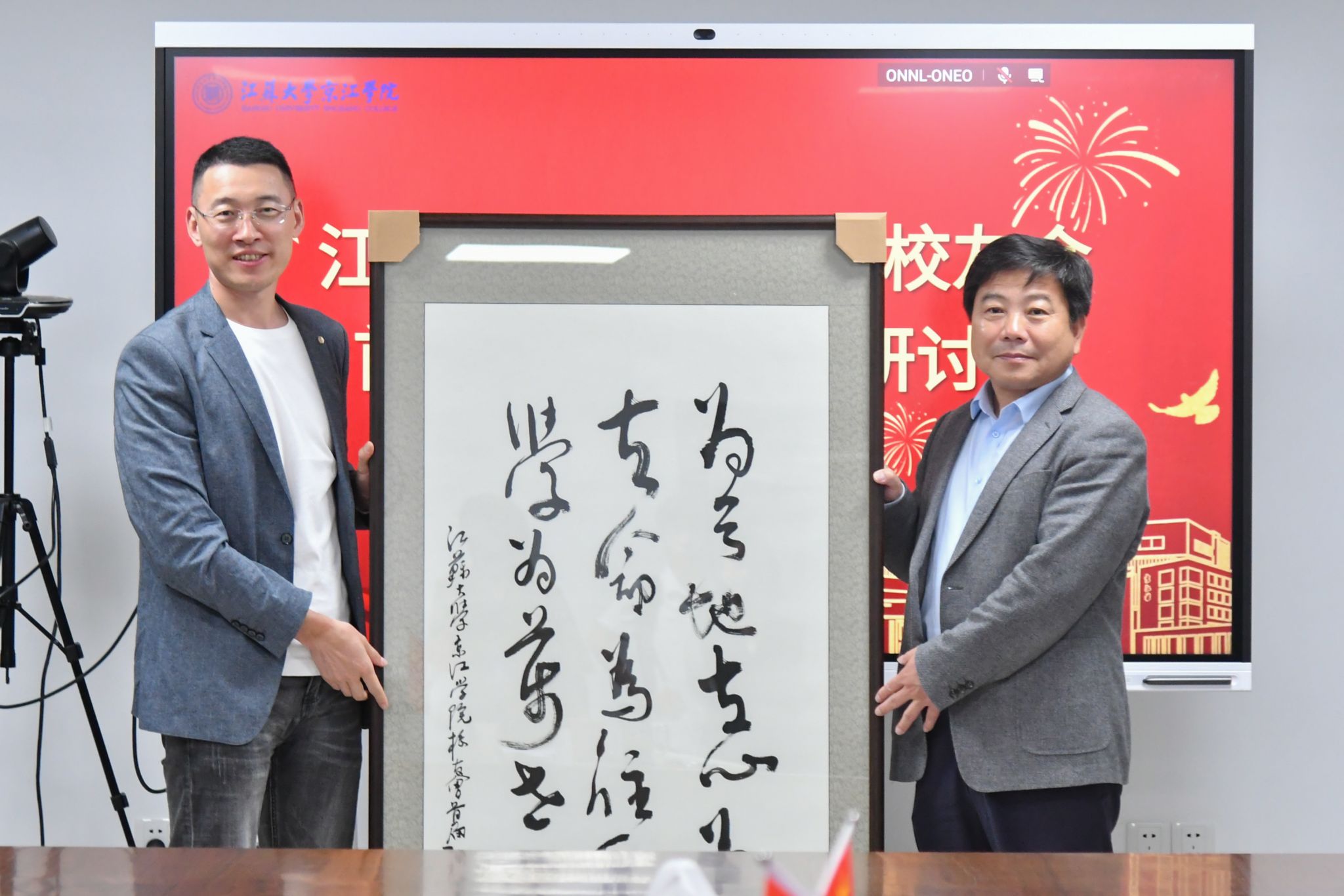 第三环节,参会人员共同讨论并通过第一届理事会2023年工作方案。周君君向与会院领导报告了方案内容及有关思考。赵喜仓感谢了校友们对学校工作的支持,并充分肯定了工作方案,他希望校友会充分发挥好桥梁纽带作用,成为母校与校友之间的信使,提升校友凝聚力。活动最后,周君君代表校友向母校赠送艺术家夏一栋的两幅题字,表达对母校的深情厚谊。