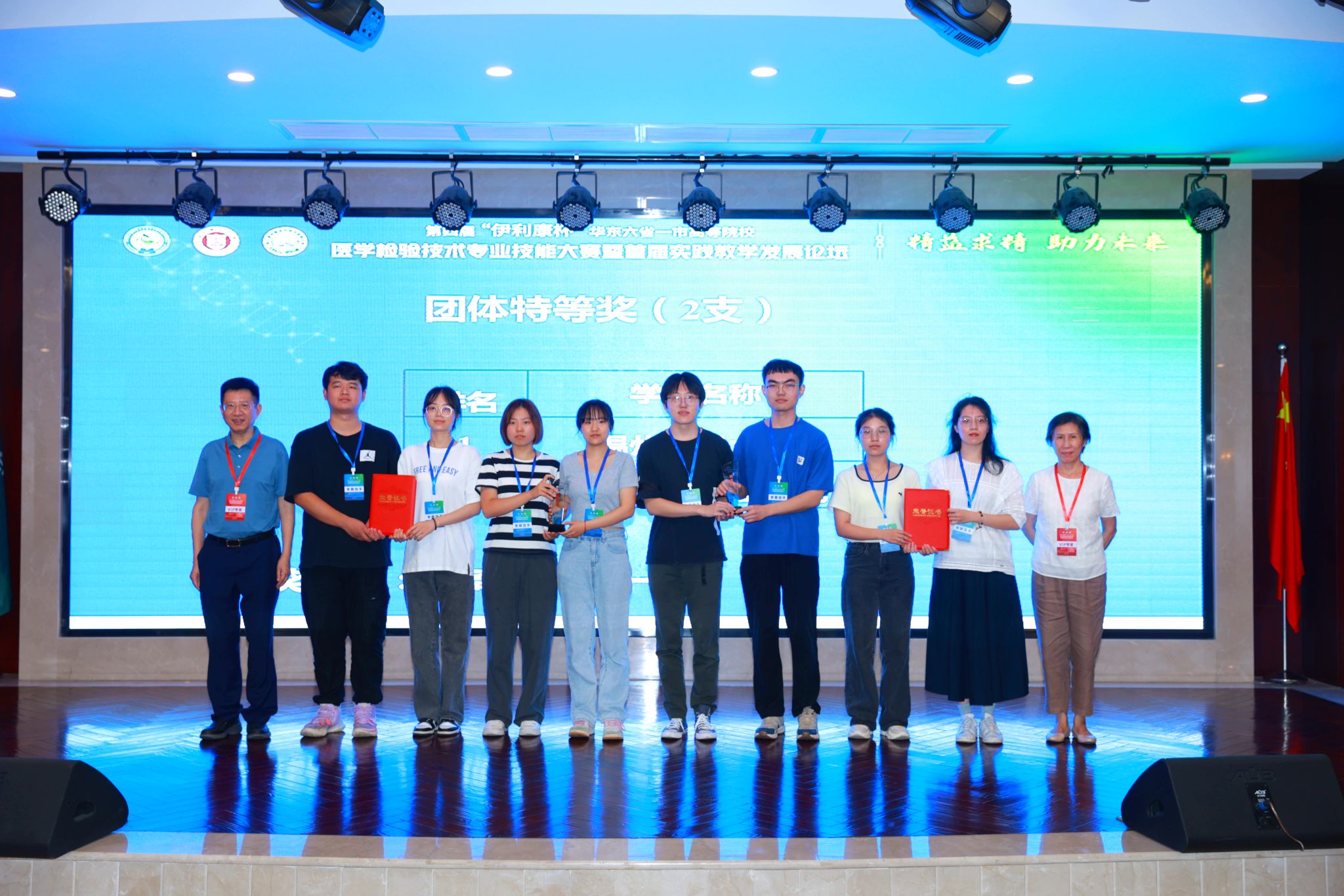 9月22-24日,第四届“伊利康杯”华东六省一市高等院校医学检验技能大赛暨首届实践教学发展论坛在温州医科大学举行,华东六省一市30所高校百余名选手积极参赛。我校医学检验技术专业成月、丁晓洁、刘仁娜和何宗庭四位同学以总分第二名的成绩斩获团体特等奖。在三个单项赛道中,成月同学在葡萄糖测定项目技能操作中获得单项金奖。