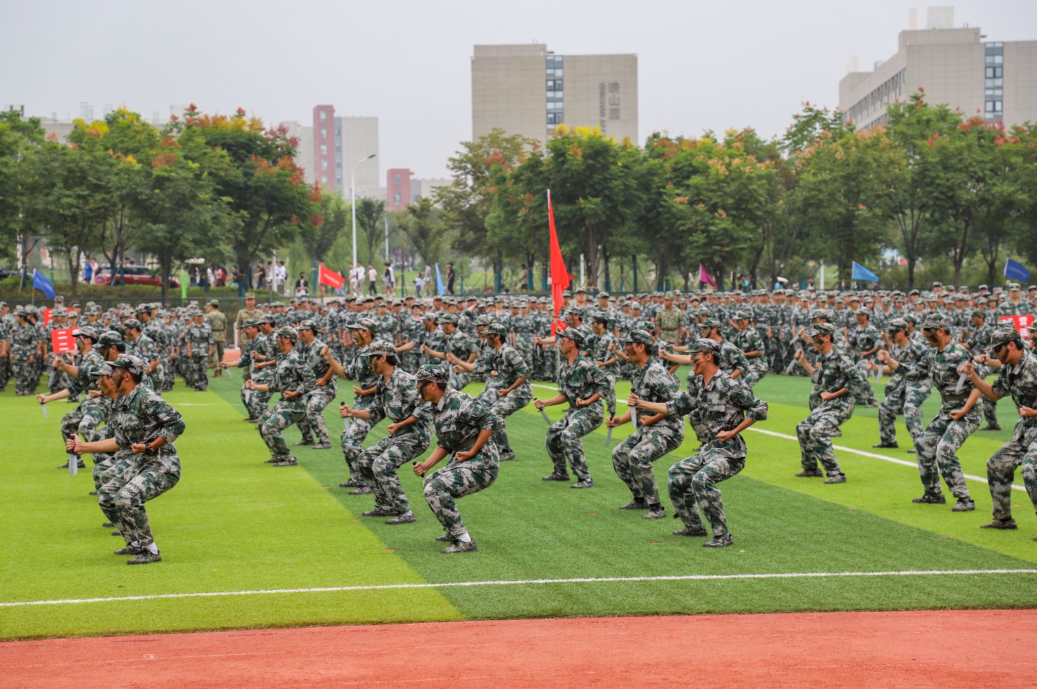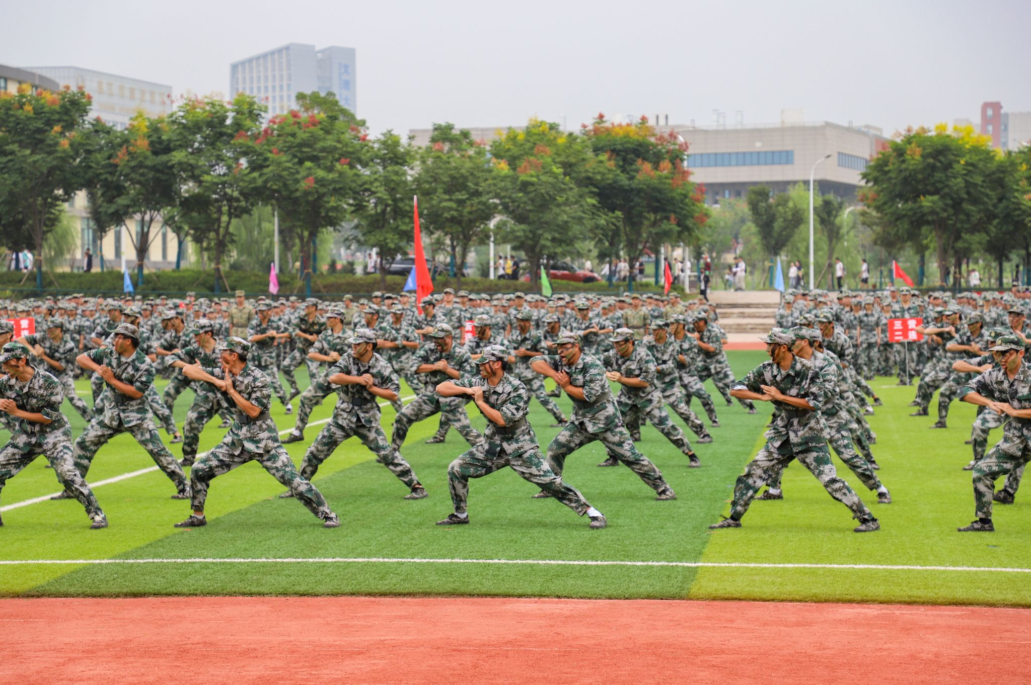 军训特色表演环节,战术进攻队形、军体拳和匕首操表演等军训特色课目依次汇报展示,他们动作整齐,士气高昂,赢得了现场阵阵热烈掌声。分列式环节,各方队精神抖擞、踏着铿锵有力的步伐依次通过主席台接受检阅。