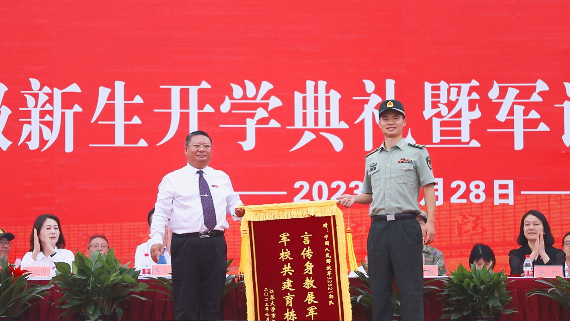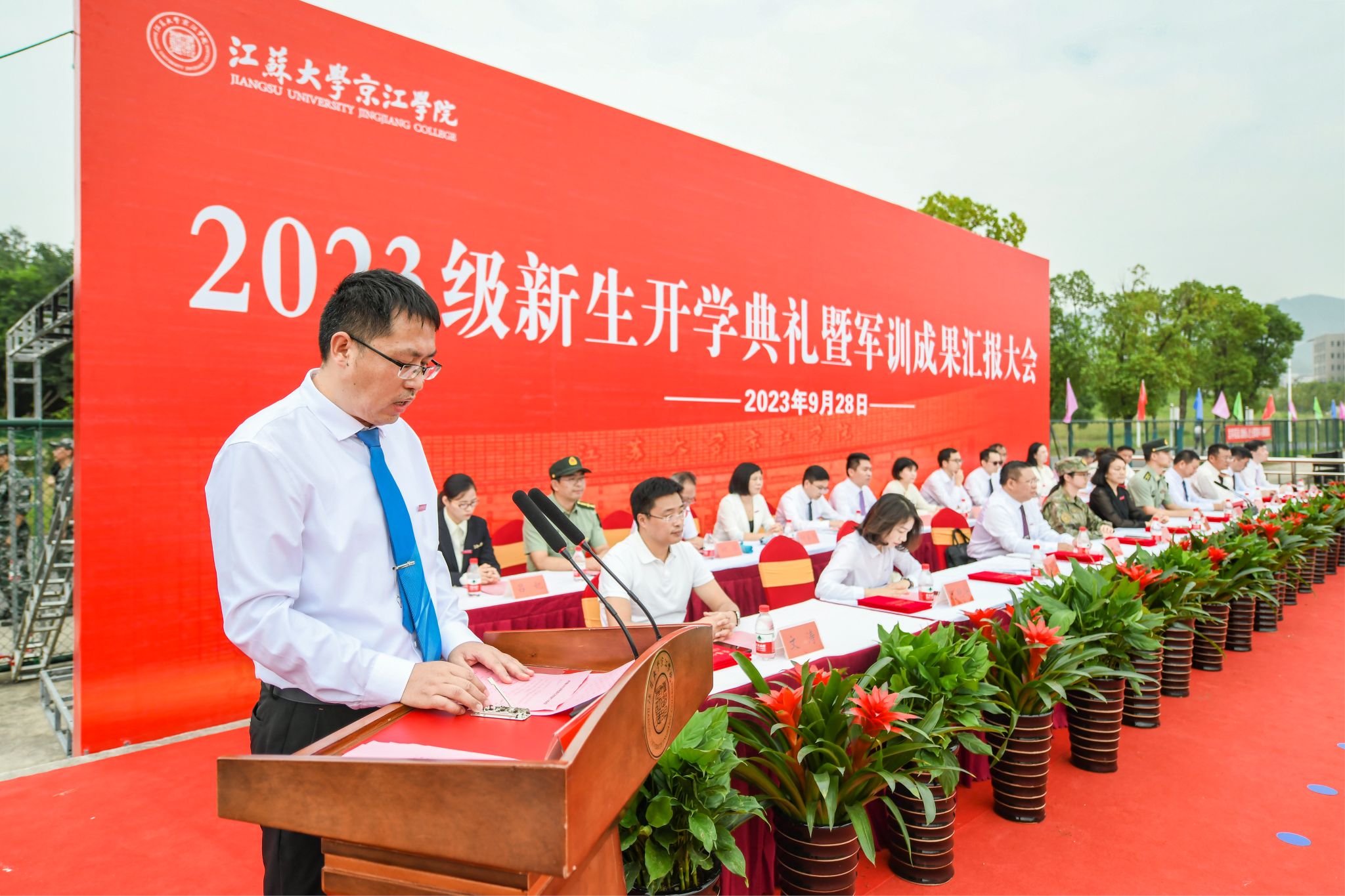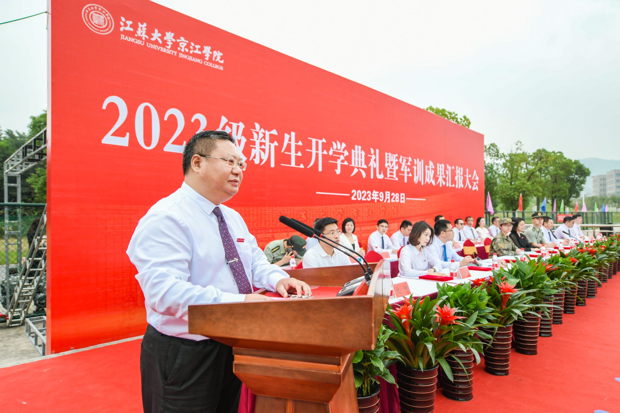 9月28日上午,江苏大学京江学院2023级新生开学典礼暨军训成果汇报会在京江操场举行。