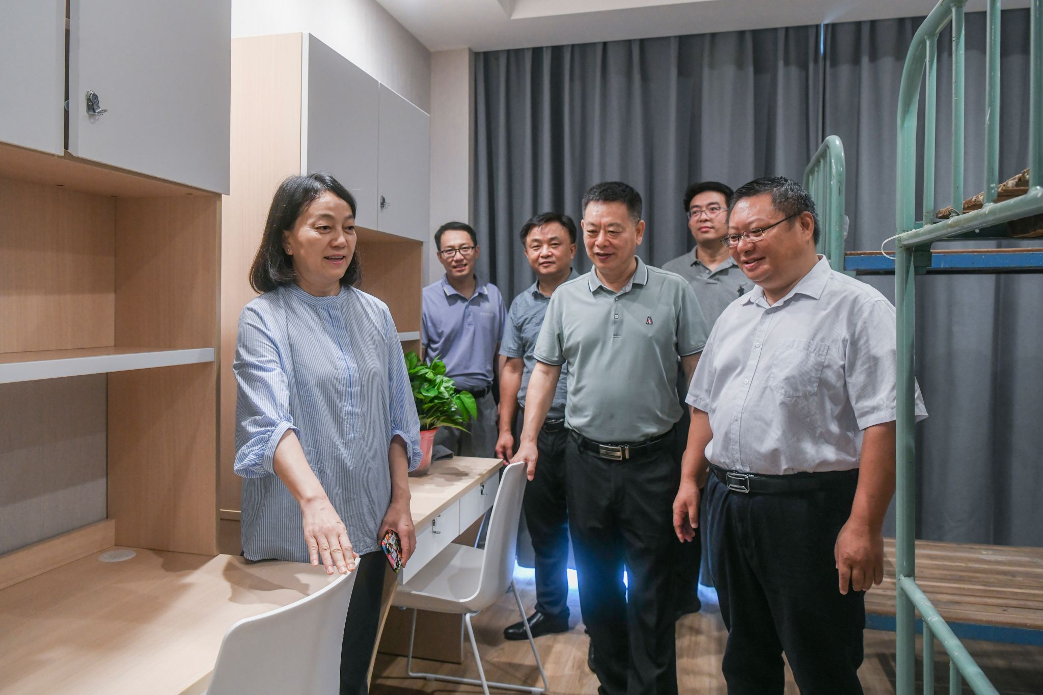 陈红重点检查了京江学院学术交流中心学生宿舍改造情况。她强调,暑期学生宿舍改造工期紧、任务重,要严把安全关、质量关和进度关,确保新生开学前完工投入使用。