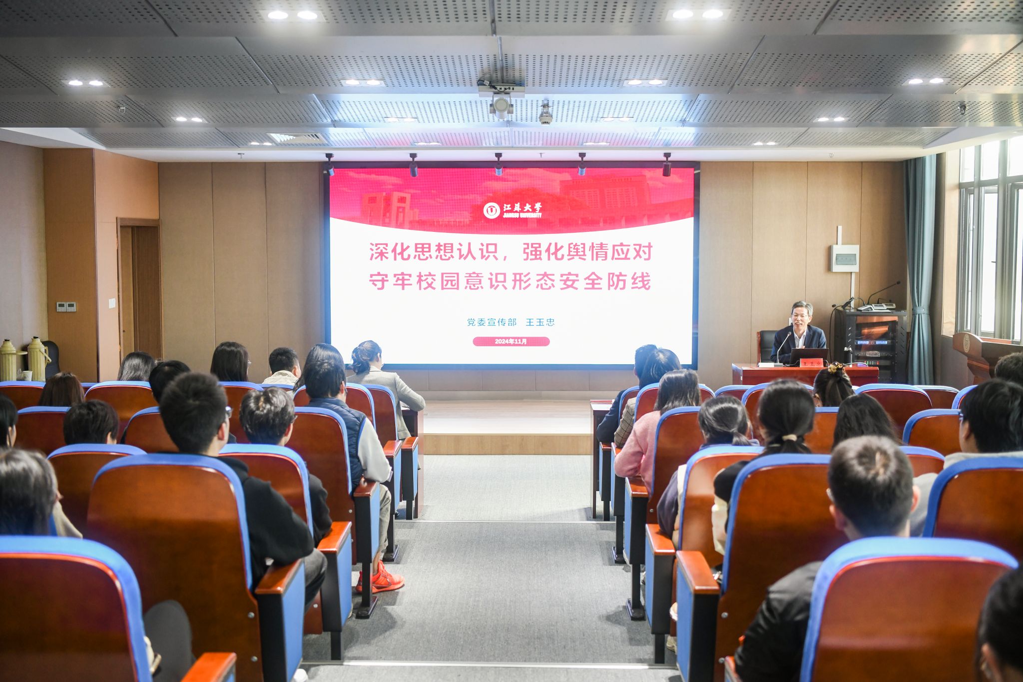 为压实意识形态工作责任制,提升京江学院宣传思想文化工作质效。11月8日,京江学院特邀江苏大学党委宣传部副部长王玉忠在学术交流中心2号报告厅作了主题为“深化思想认识,强化舆情应对,守牢校园意识形态安全防线”的讲座。京江学院党委副书记、纪委书记蒋豪,职能部门正、副职,各二级学院(部)党总支书记,全体辅导员以及学院网络舆情管理员、网评员参加培训。讲座由党群工作部部长丁红梅主持。