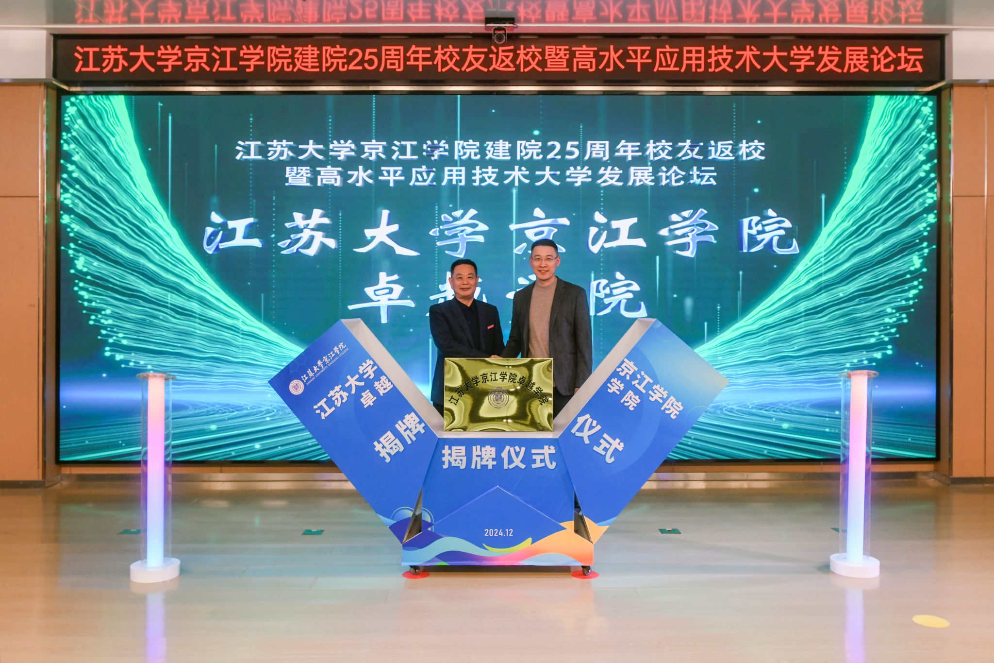 江苏大学京江学院党委书记崔金贵和周君君总经理共同为江苏大学京江学院卓越学院揭牌。
