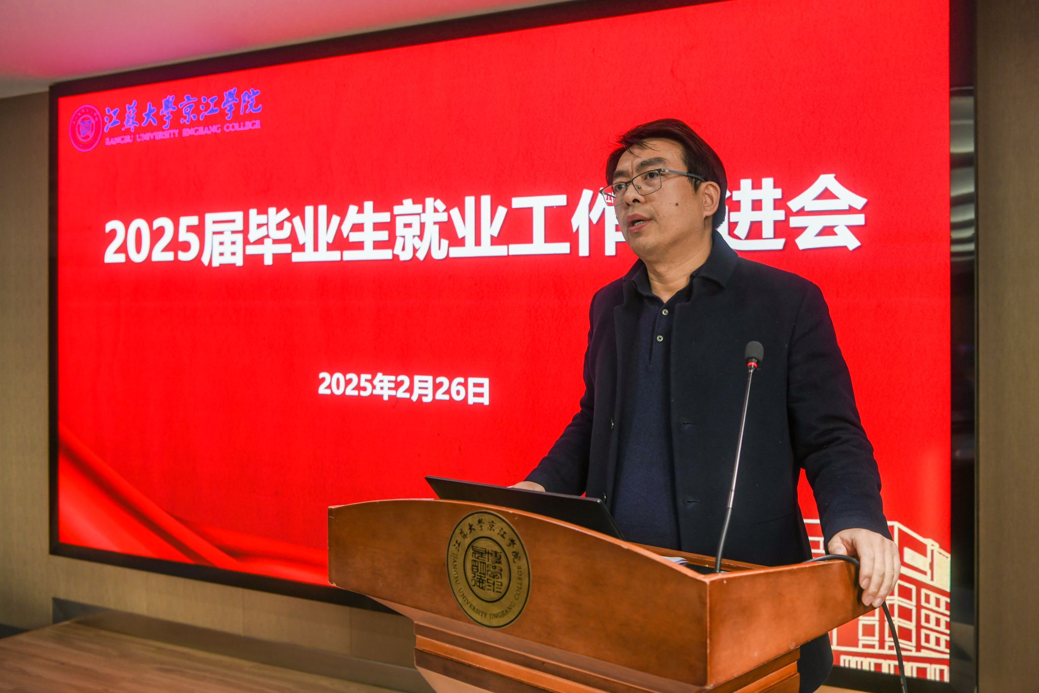 2月26日,京江学院在学术交流中心第二报告厅召开2025届毕业生就业工作推进会,会议深入分析研判当前形势下京江学院就业工作面临的新挑战、新任务、新要求,并部署落实2025届毕业生就业重点工作。京江学院全体院领导、各职能部门和各二级学院(部)主要负责人及辅导员参加了会议。会议由学生工作部部长赵吉庆主持。