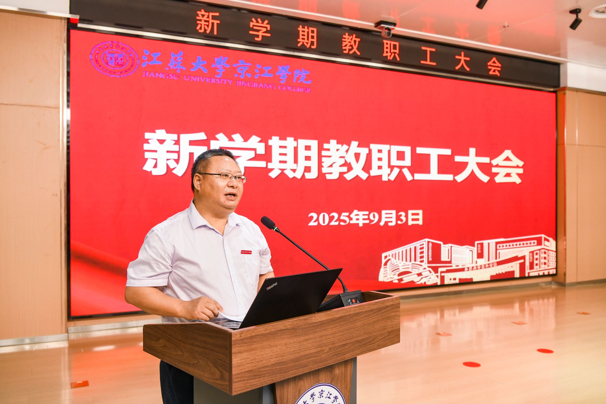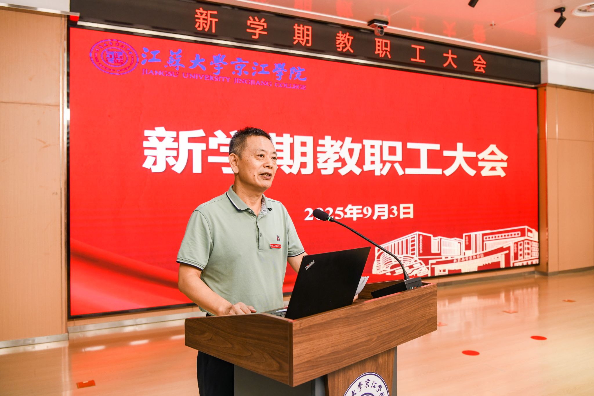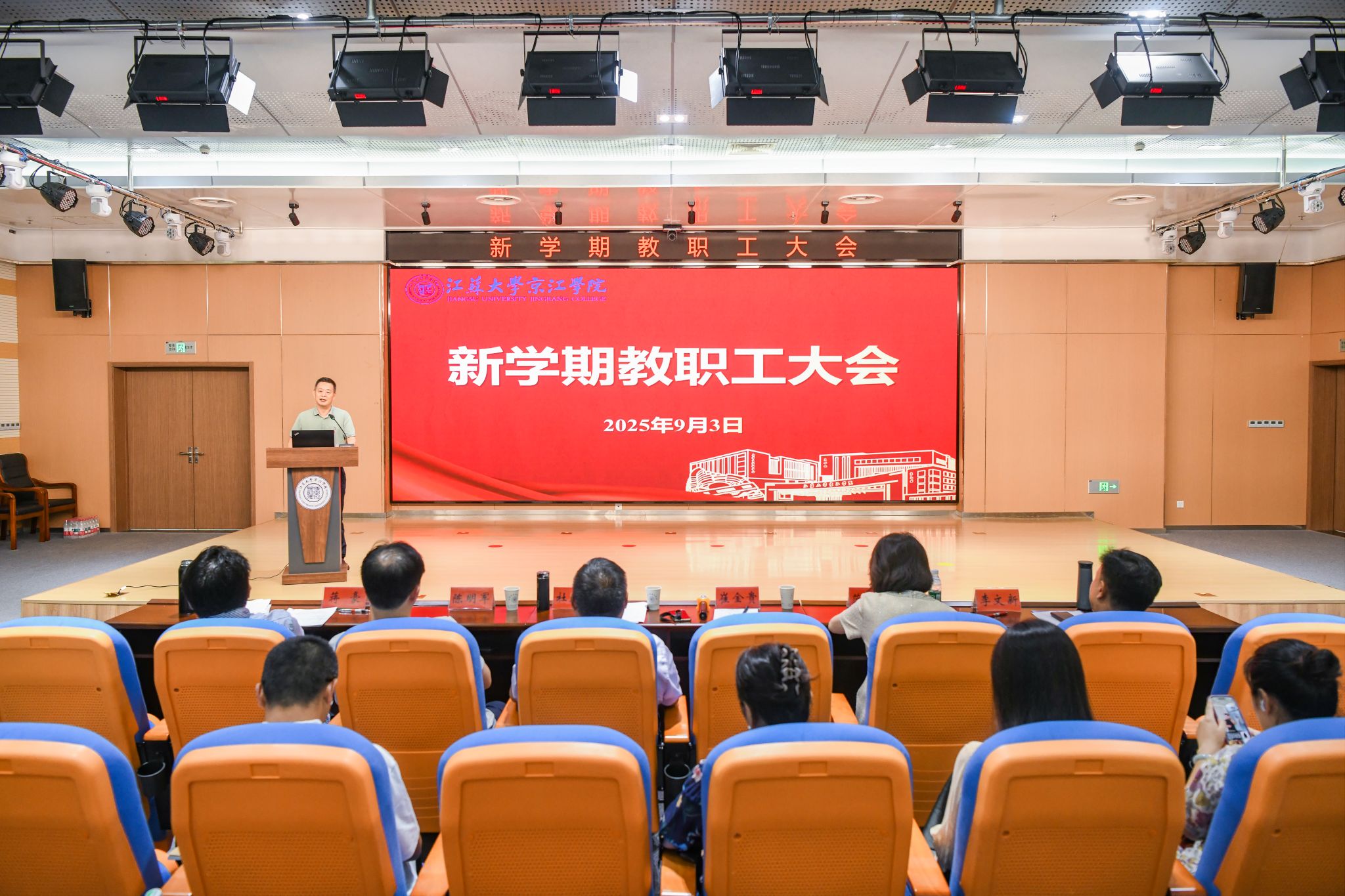 9月3日下午,京江学院在学术交流中心4号报告厅召开新学期教职工大会,院领导班子及全院教职工参加会议。会议由院党委书记崔金贵主持。