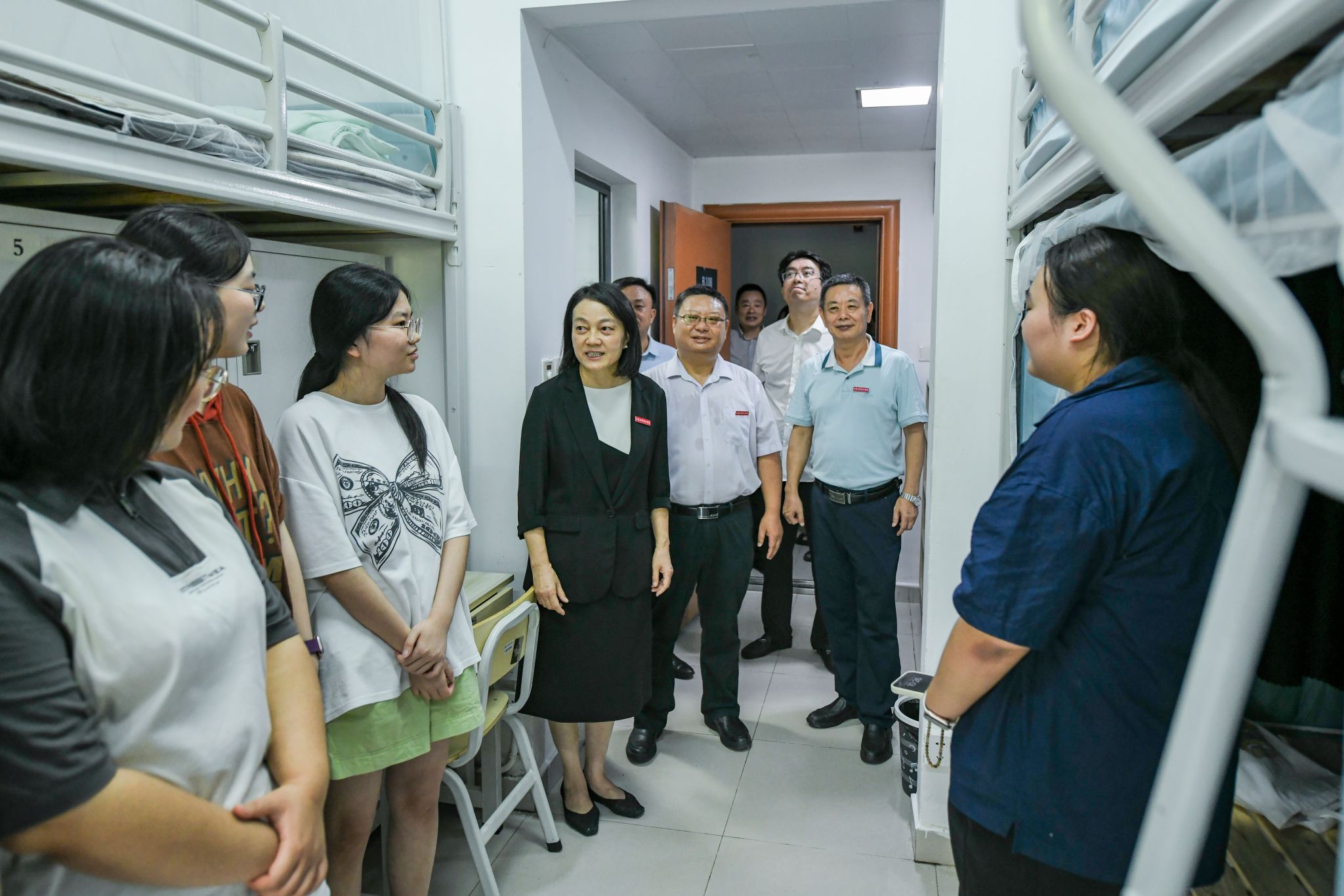 陈红一行来到迎新报到点,实地查看报到流程,详细了解新生到校情况,并亲切慰问现场工作人员。随后,陈红一行深入公寓看望新生,与同学们亲切交谈。她勉励同学们要互相关心、团结友爱,尽快完成角色转变,主动适应大学生活,积极融入京江学院这个温暖的大家庭;同时希望同学们珍惜大学时光,坚定理想信念,树立远大目标,勤奋治学,全面发展,努力成长为德才兼备、堪当大任的时代新人。同学们对校领导的关怀深表感谢,纷纷表示将牢记嘱托,以积极向上的姿态开启大学生活,不负青春、奋发进取。