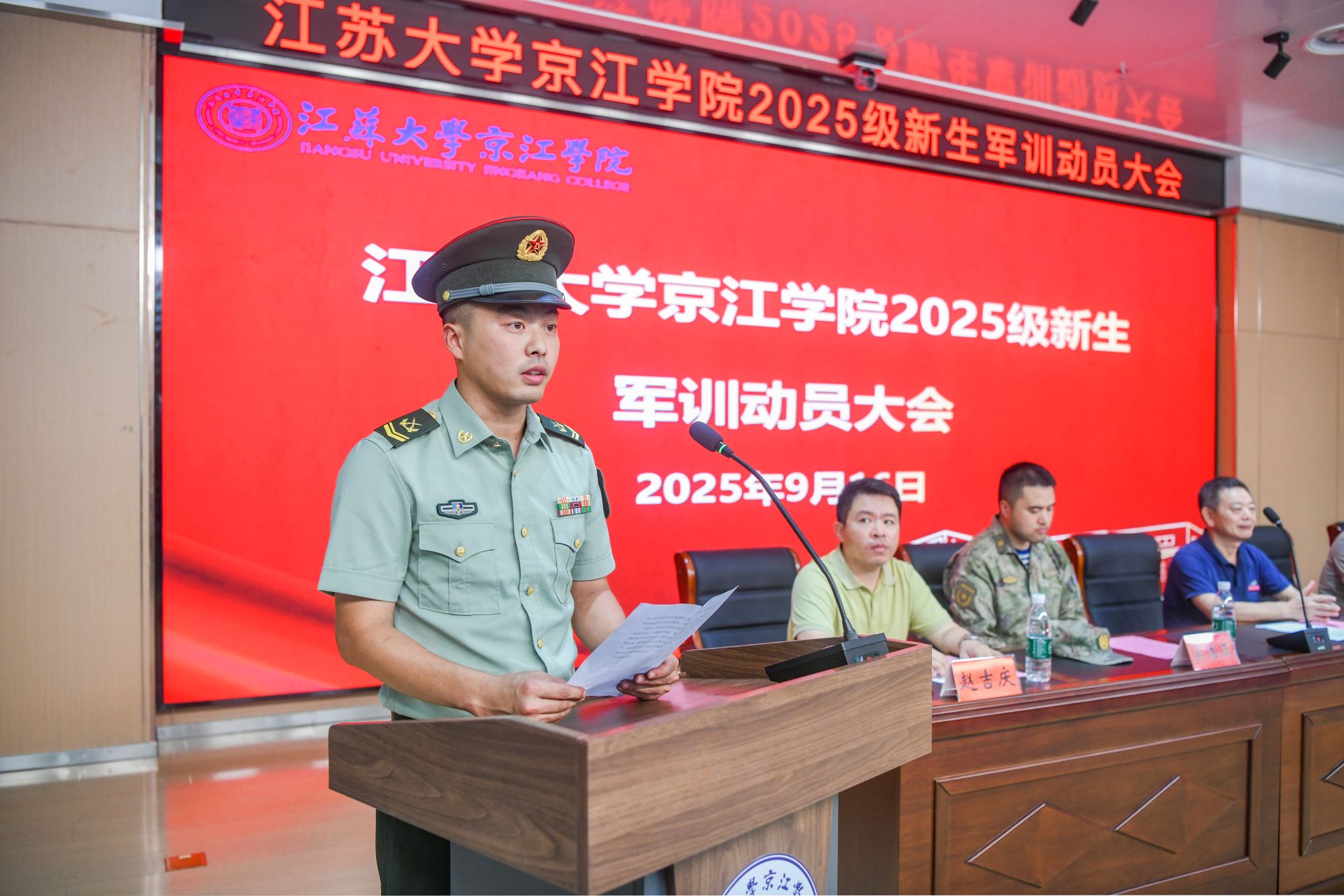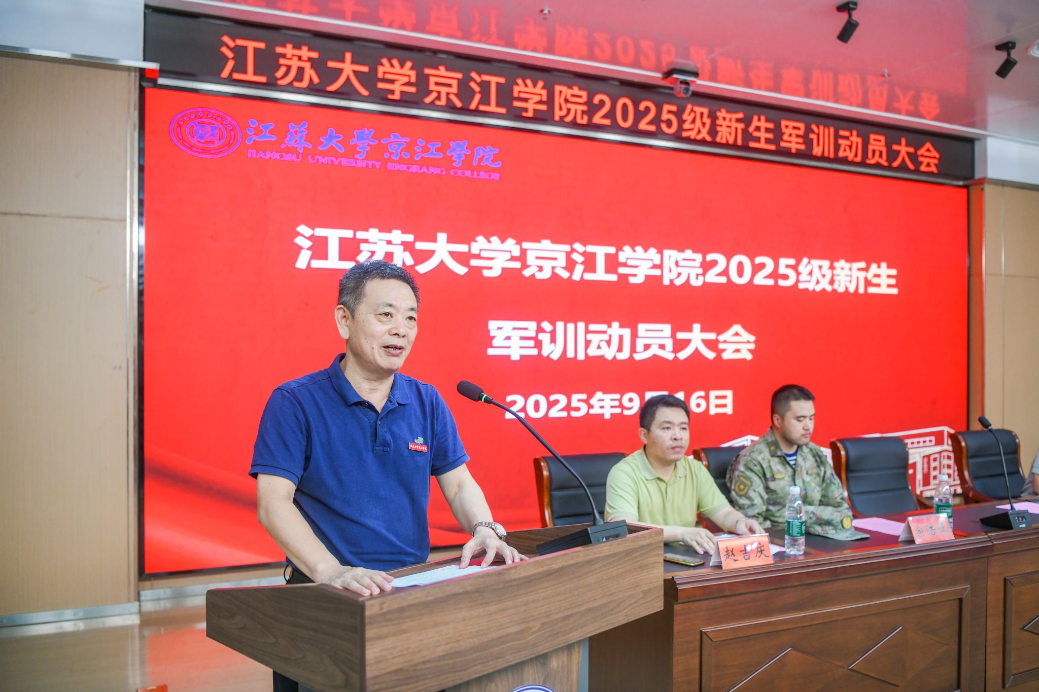9月16日下午,京江学院在学术交流中心第四报告厅召开2025级新生军训动员大会。京江学院党委书记崔金贵、中国人民解放军32521部队保障处处长程扬、军训工作领导小组成员、承训部队全体教官、各二级学院(部)党总支书记、全体新生辅导员及参训学员代表参加了动员大会。动员大会在庄严的国歌声中拉开帷幕,大会由京江学院党委副书记、纪委书记蒋豪主持。