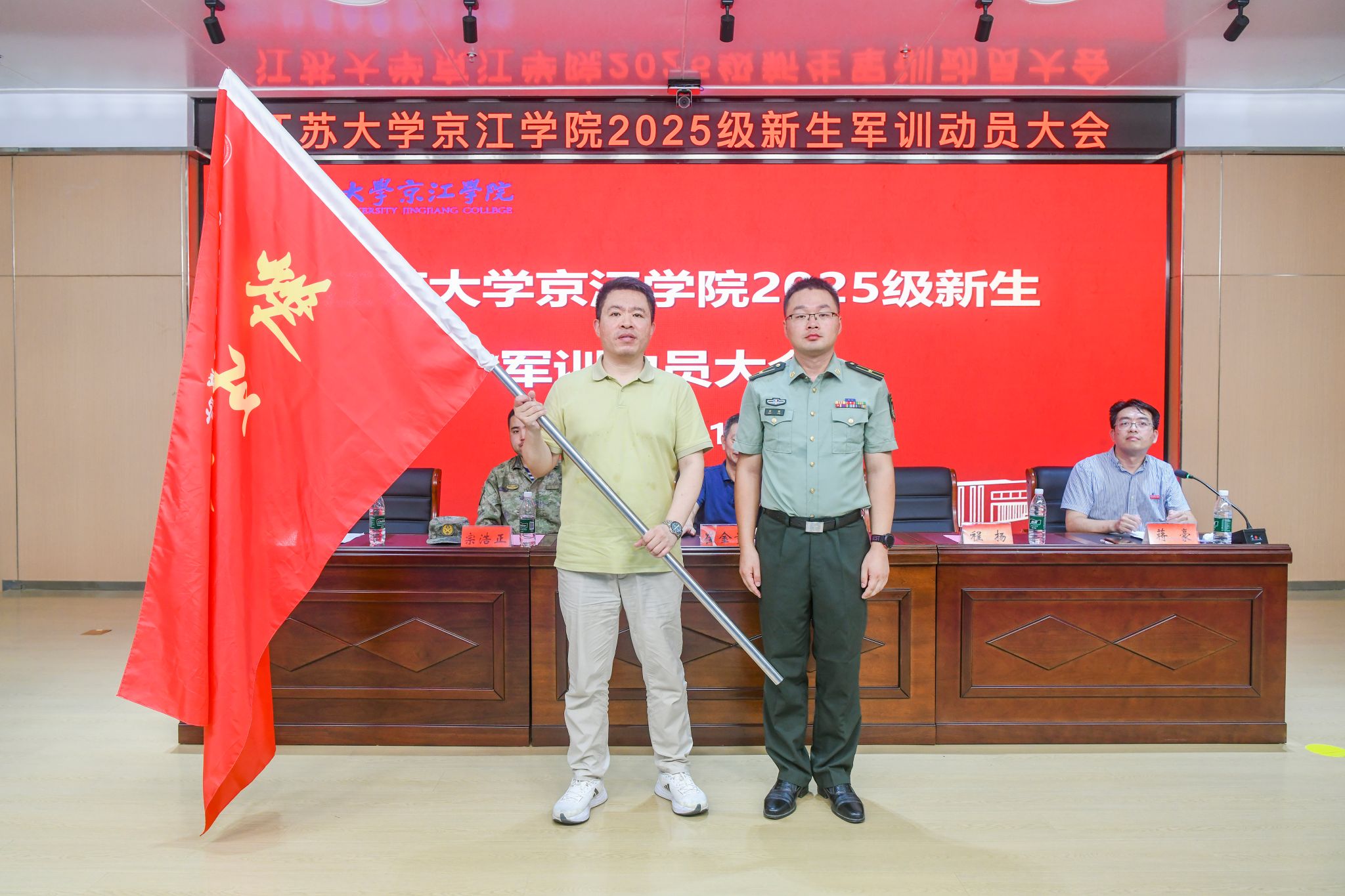 学生工作部部长、军训团团长赵吉庆宣读“京江学院2025级学生军训团编成”。中国人民解放军32521部队保障处处长程扬向军训团授旗,军训团团长赵吉庆接旗。旗帜的传递标志着2025级新生军训工作正式全面启动。(撰稿单位:学生工作部/图片来源:综合办公室)