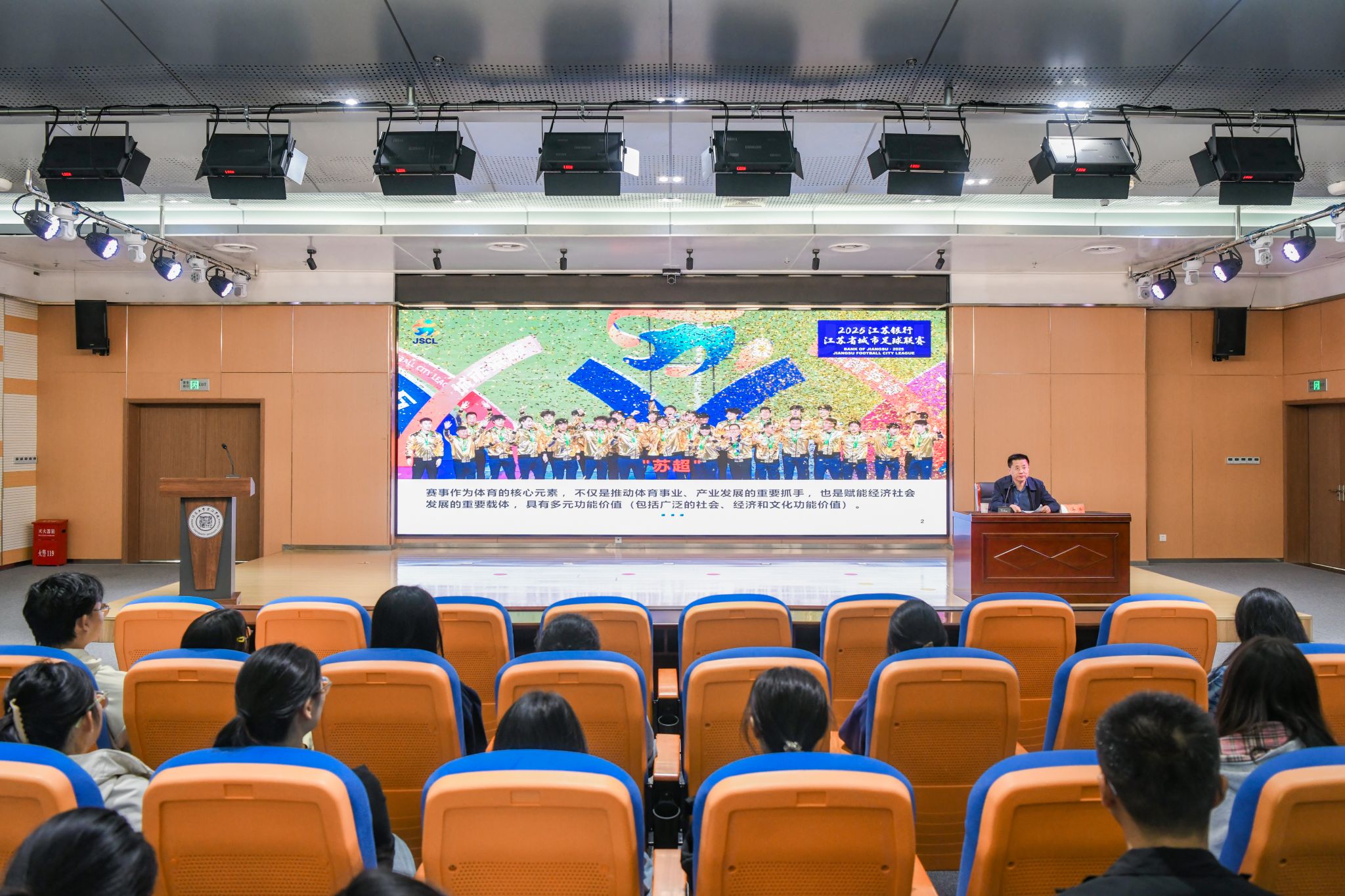 张海涛从“苏超”火爆出圈成为现象级体育赛事、彰显赛事经济的强大引擎带动作用,江苏省培育发展赛事经济的主要做法以及关于培育发展赛事经济的体会等三个方面展开深入讲解,以宏阔的视野、详实的数据和生动的案例,展示了“苏超”赛事的非凡魅力与巨大成功,更从政治答卷、发展答卷、民生答卷的高度,深刻阐释了培育赛事经济的战略意义与实践路径,其讲解使与会师生对体育所蕴含的多元价值与巨大能量有了全新的认识,也为推动京江学院人才培养和服务社会提供了宝贵的启示。授课过程中,现场师生认真聆听、仔细记录,不时以热烈掌声回应精彩论述,现场学习氛围浓厚。