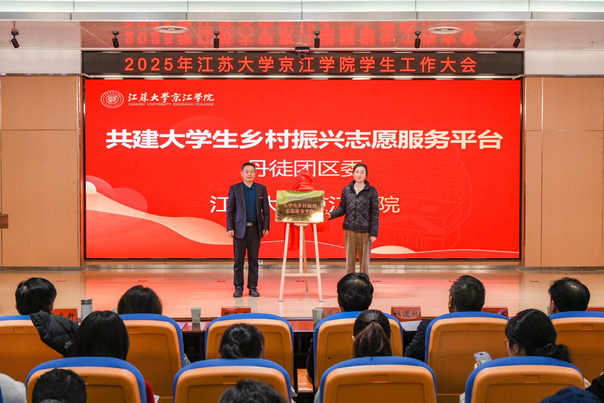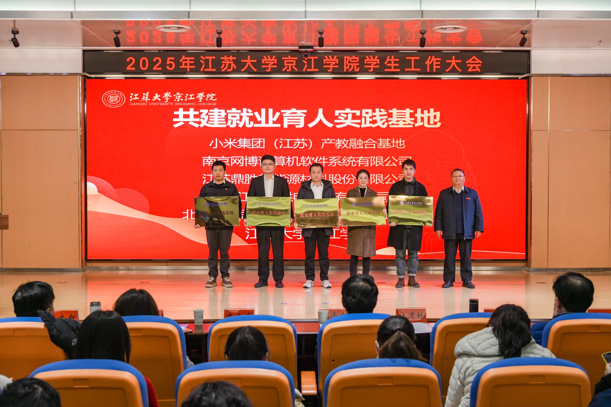 为拓展育人平台、深化校地校企合作,京江学院与多家单位现场举行了揭牌、授牌仪式:与镇江市博物馆共建“爱国主义教育基地”;与共青团镇江市丹徒区委员会共建“大学生乡村振兴志愿服务平台”;与马鞍山市人才综合服务中心、盐城市盐都区人才服务中心、无锡市新吴区人力资源管理服务中心共建“引才工作站”;与小米集团(江苏)产教融合基地、南京网博计算机软件系统有限公司、江苏鼎胜新能源材料股份有限公司、镇江三新供电服务有限公司、北京学而思教育科技有限公司镇江分公司共建“就业育人实践基地”。