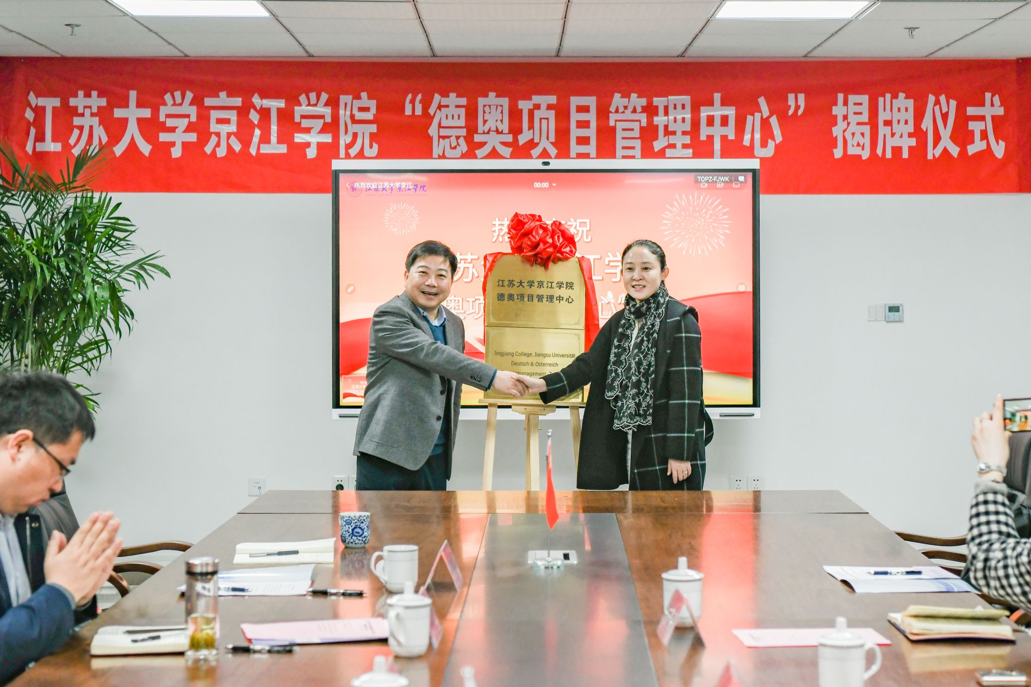 伴随着掌声,赵喜仓和唐小娟为“德奥项目管理中心”正式揭牌。此举也标志着双方的战略合作关系向更深层次方向推进。(撰稿单位:综合办公室)