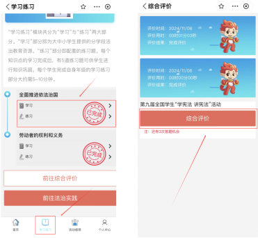 ②完成两个板块后,在底部【学习练习】中点击【前往综合评价】,在页面中点击【综合评价】,完成后可在综合评价页面查看“宪法卫士”标识。