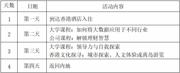 费用不含:内地往返香港机票、港澳通行证及香港旅游签注费用、每天下午结束后返回酒店交通费用、项目期间餐费、其他个人消费。