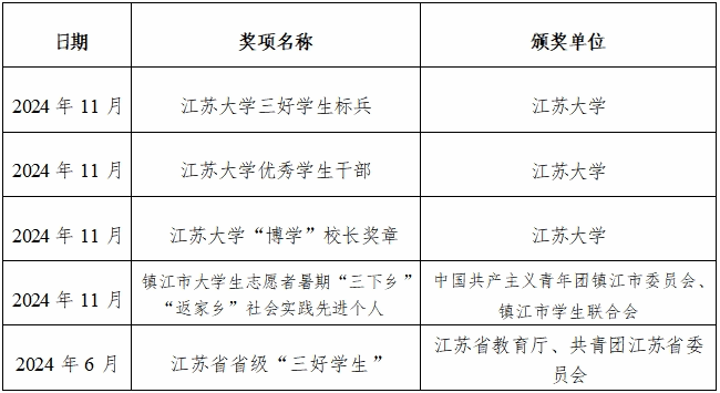 6.表格中“获奖情况 ”的填写要确保完整准确,其中 “奖项名称 ”要和证书上的名称完全一致,“颁奖单位 ”以 获奖证书上的公章全称为准,排列顺序按获奖时间由先到后。 获奖时间从入学至 2025 年 7 月 31 日期间,填写 3-4 个奖项即可(所填写的奖项需同步提交证书复印件至学工部209, 还没有颁发证书的奖项不写)。