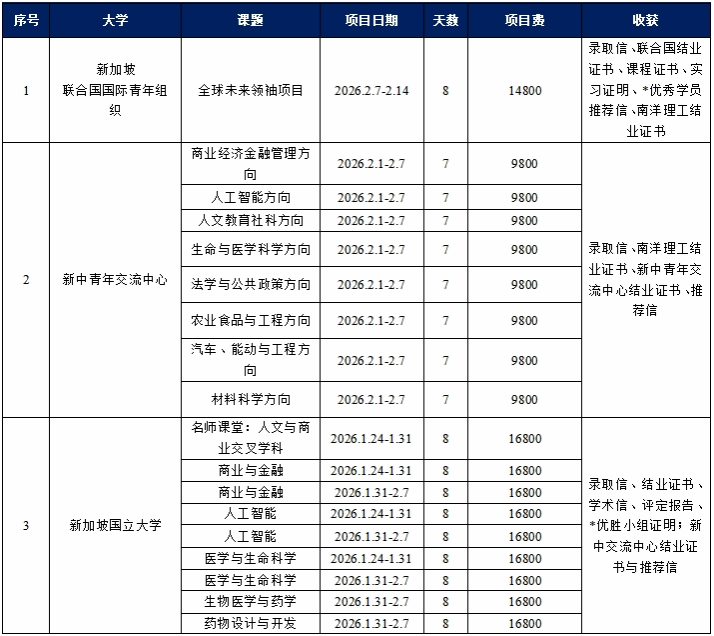 详细内容:以上项目详情请见项目简章,包括课程时间、课程内容、项目收获、住宿、后勤等以简章为准;