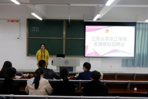 12月1日,江苏大学京江学院学生会、科协在京江新校区五号教学楼联合举办学院首届模拟招聘会。活动分为初试和复试两个部分,活动复试由江苏大学管理学院苏从斌老师,江苏大学京江学院王亚洲老师,壹点教育负责人刘君丞先生及学生代表担任面试官。