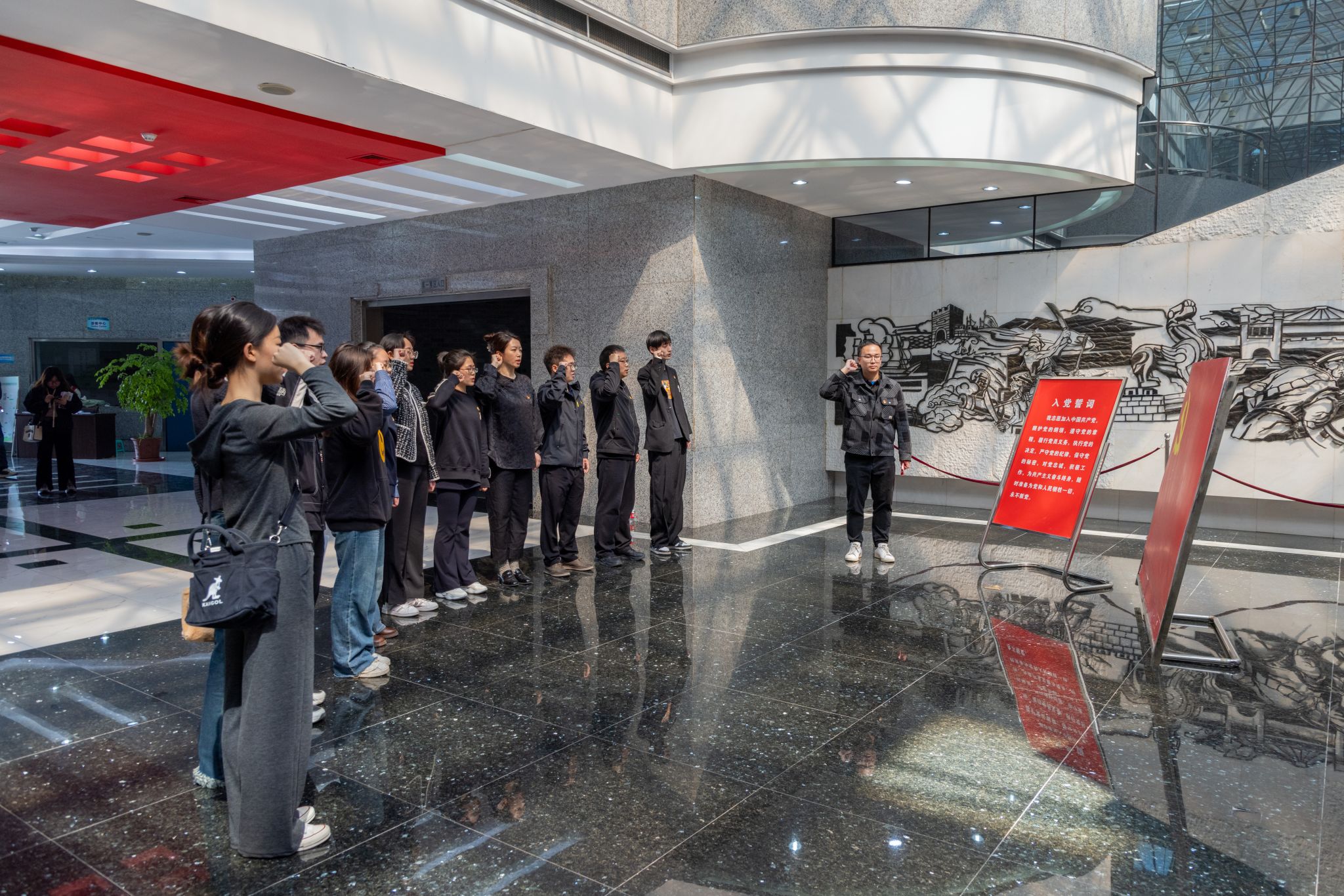 颂词《烈士雕像》,追思革命先烈,并向抗战英烈敬献鲜花。在财经学院党总支副书记冯思奇带领下,全体党员在党旗下重温了入党誓词。最后,全体