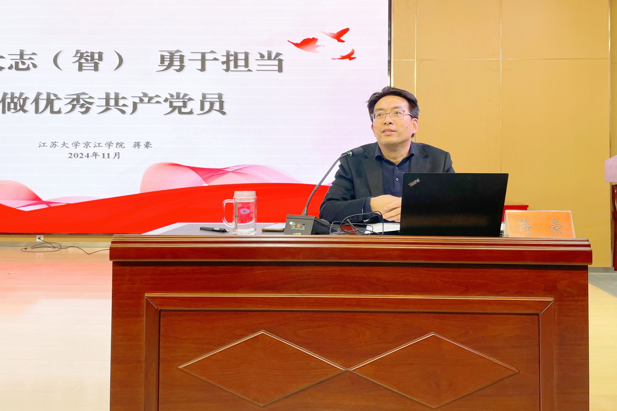 蒋豪以《胸怀大志(智) 勇于担当 争做优秀共产党员》为题,通过分享自己的求学和工作历程,结合学院杰出毕业生的实例和历史人物的传奇故事,围绕志存高远立大志、勤于学习成大智、脚踏实地担大责、慎独慎微养大德等方面,勉励青年大学生提升自身修养,培养健康的生活情趣,加强自我约束,争做廉洁自律的模范。