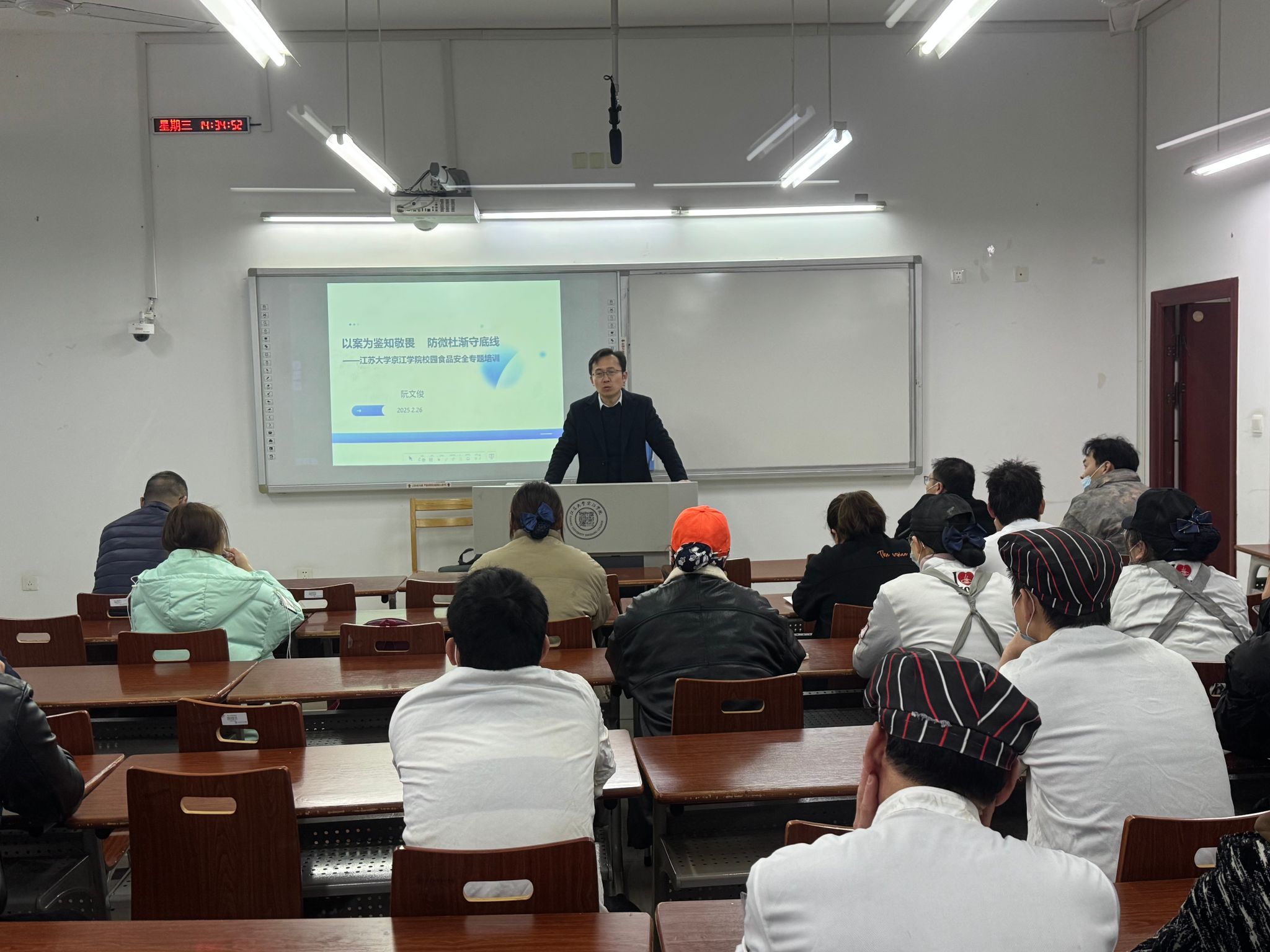 阮文俊详细讲解了食堂管理及食品安全风险防控等相关内容,从采购贮存、清洗消毒、烹调加工、个人及环境卫生、有毒有害物质等方面,提出了加强食品安全管理的具体措施。会后,阮文俊前往京江学院第一食堂,对食品加工操作环节和硬件设备设施提出了指导意见。