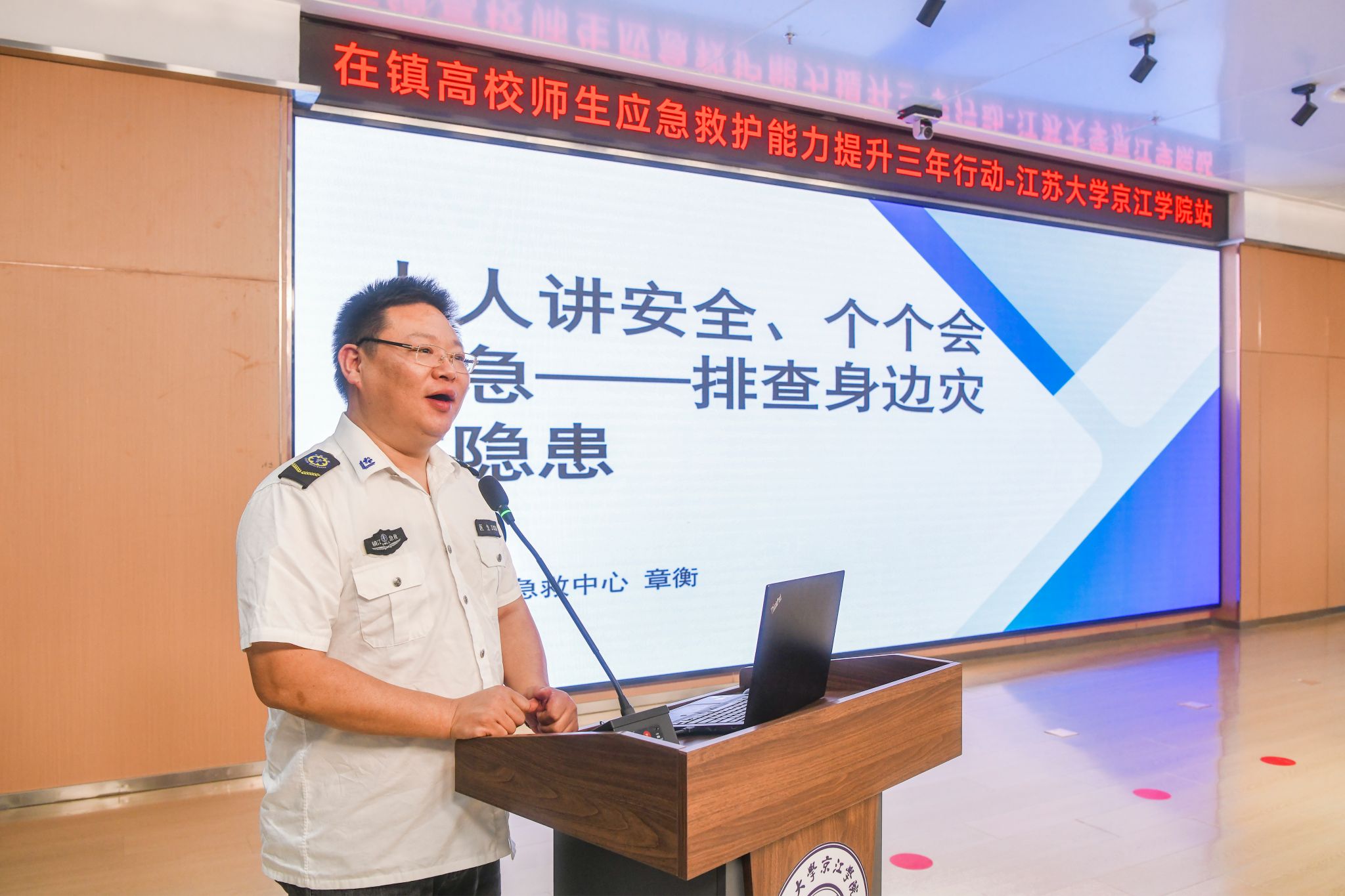 活动在京江学院副院长李文新的致辞中拉开帷幕。他强调,防灾减灾与应急救护是校园安全的重要组成部分,此次活动是落实“人人讲安全、个个会应急” 理念的具体实践,希望师生以学促行,将急救知识转化为守护生命的能力。