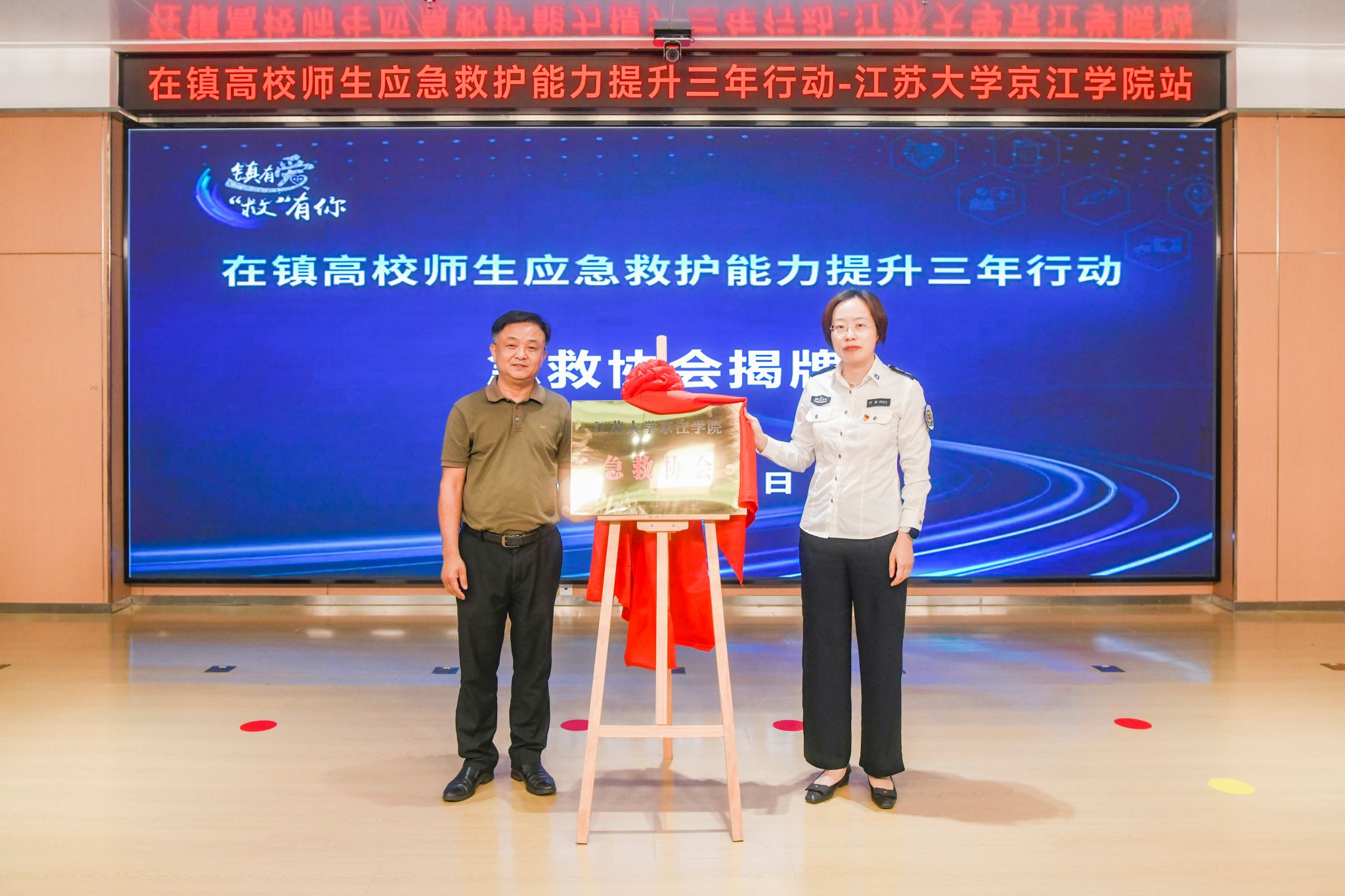 随后,李文新与蒋韵主任共同为“江苏大学京江学院急救协会”揭牌。该协会的成立标志着学校应急救护工作进入“学生自主管理、师生共同参与”的新阶段,未来将通过组织培训、科普宣传等活动,带动更多师生掌握急救技能。