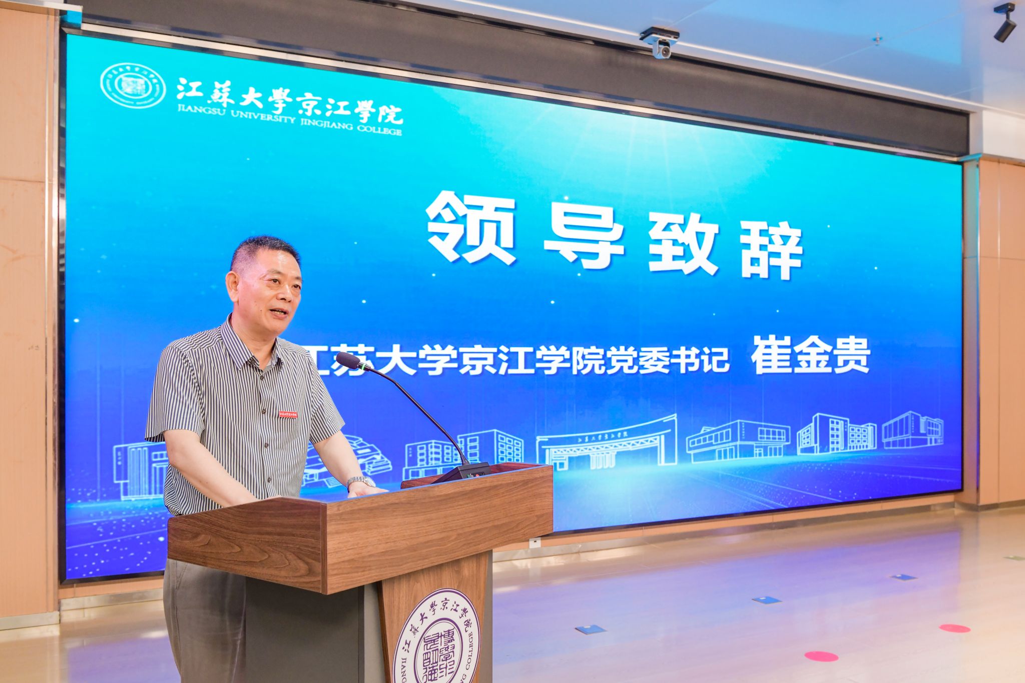 镇江市长山产教融合发展区管理办公室党委副书记、高投集团董事长高超,镇江市人力资源市场管理办公室主任赵蕾,河北省大名县人力资源和社会保障局副局长杜志勇、人才中心主任胡发文,扬州大学广陵学院院长凌云志、党政办公室主任王义全,江苏杰特思哲人才科技集团董事长高翔,行业企业代表,江苏大学京江学院全体院领导、教师代表、学生代表出席大会。