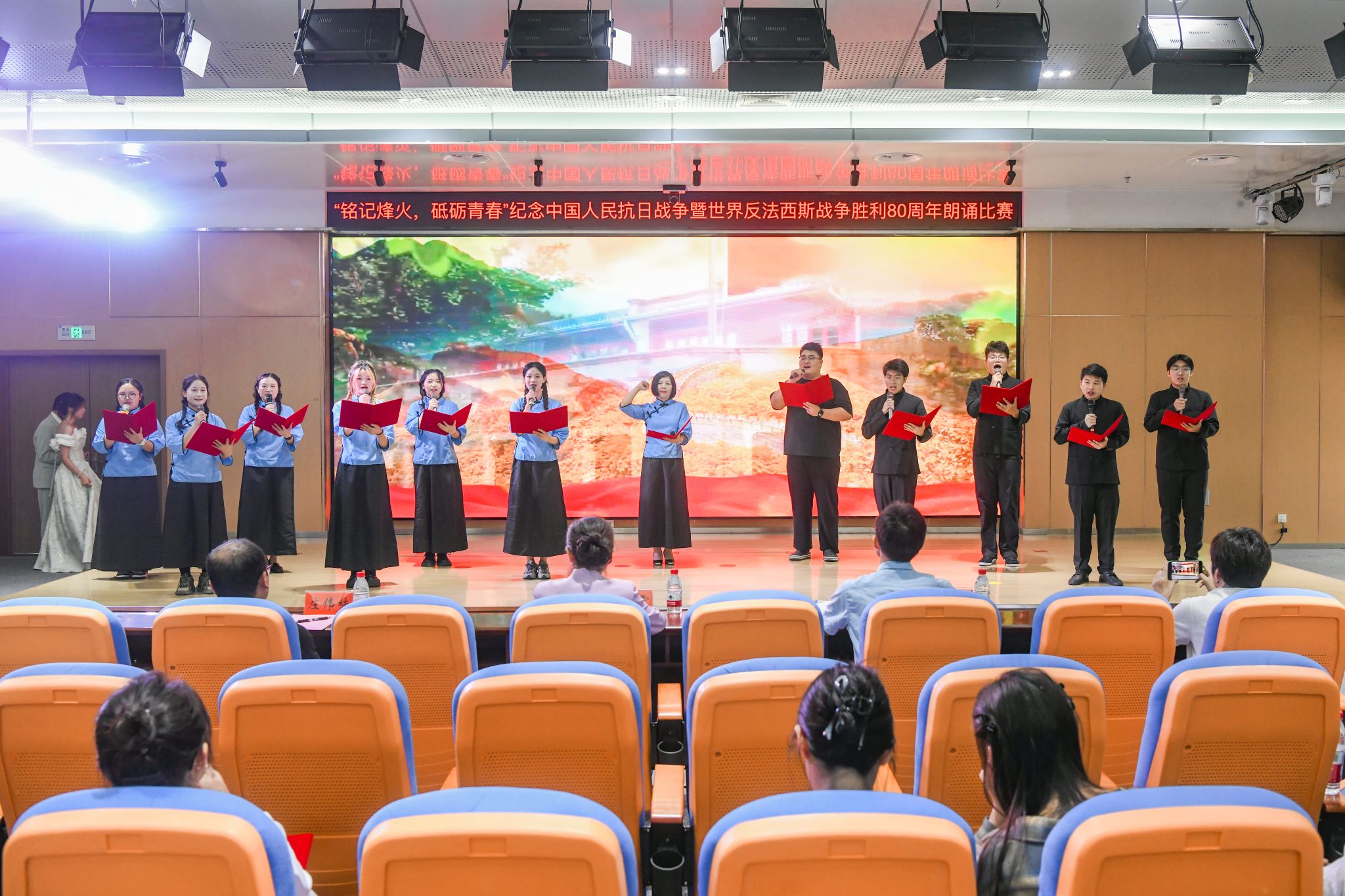 本次比赛吸引了来自全院各单位的8支师生团队同台竞技。各参赛队伍依次登台,倾情演绎了《山河永念 盛世如愿》《不屈的丰碑 复兴的征程》《八秩回响 丰碑荣光》《民族的丰碑》《那一抹红》《青春中国》《那束光》《不朽》等一系列主题鲜明、内涵深刻的朗诵作品。