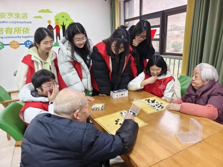 启动仪式后,师生们携手开展护老植绿活动。大家分工协作、有条不紊地完成挖坑、扶苗、培土、压实等环节,同步悬挂爱心寄语卡片,将绿意与温情送至老年群体身边,以植绿护老践行生态文明理念、传递人文关怀。与此同时,护理专业志愿者走进老人活动区域,与老人们谈心聊天、切磋棋艺,细致讲解日常康养知识,用专业素养与真诚服务温暖人心,充分展现当代青年大学生的责任与担当。